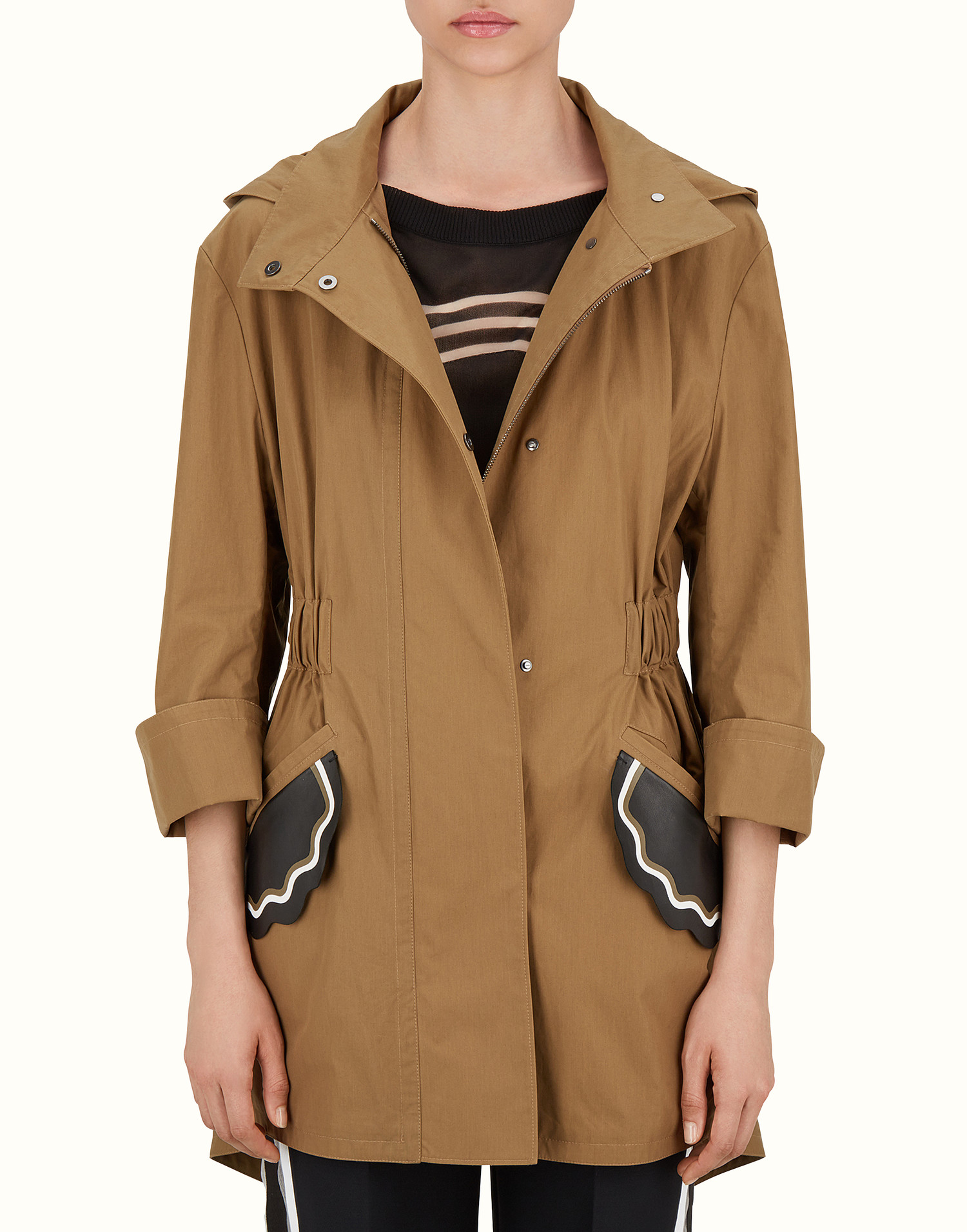 Her parka features a wide hood, drawstring waist, side pockets with two-tone wave pattern leather, and a covered zip-fastening with snap buttons.