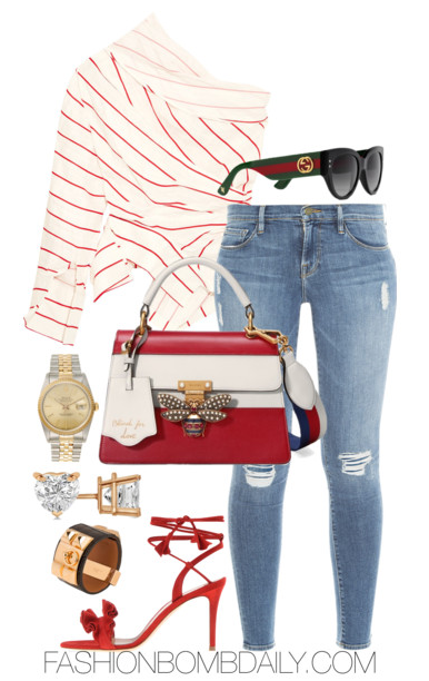 Keep it cute and casual in a twisted red and white striped one-shoulder top paired with distressed blue skinny jeans.
