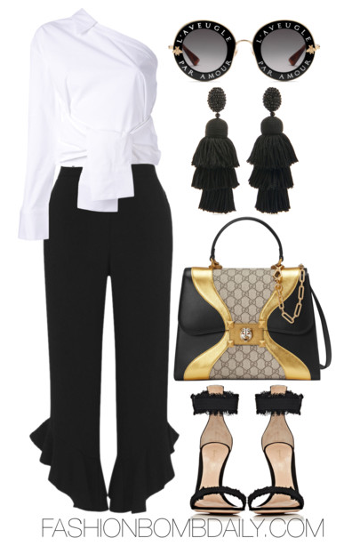 Opt for a monochromatic look in a pair of black frill hem cropped pants and a white one-shoulder poplin top.