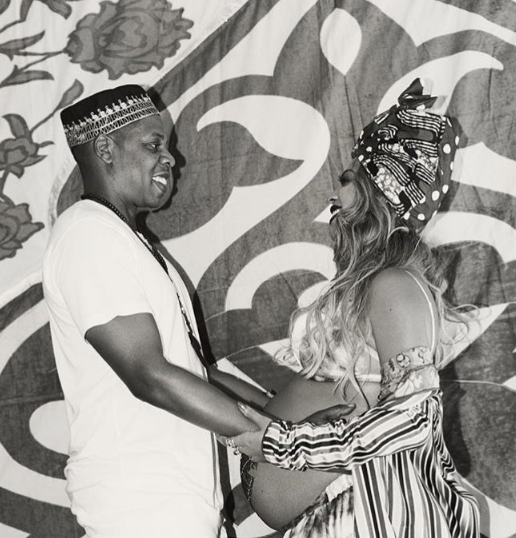 The lady of the hour showed off her belly in a custom Reuben Reuel layered ruffle skirt. Jay Z sidled to her side in all wide and an African pendant necklace.