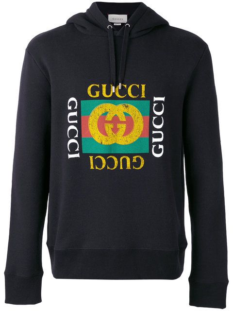The black, long sleeve, french terry hoodie features the Gucci logo graphic printed at front and drawstrings at the hood.