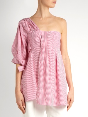 The single shoulder blouse features an elbow-length sleeve that’s nonchalantly finished with a self-tie cuff, and falls from a bandeau-style neck into a flattering pleated front with a draped panel for further definition.