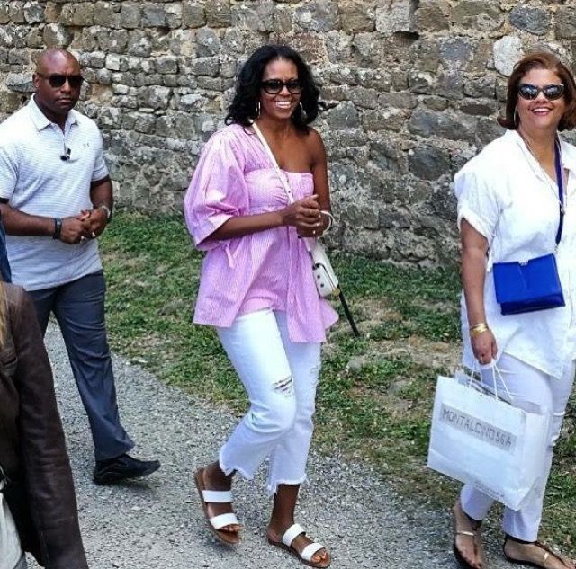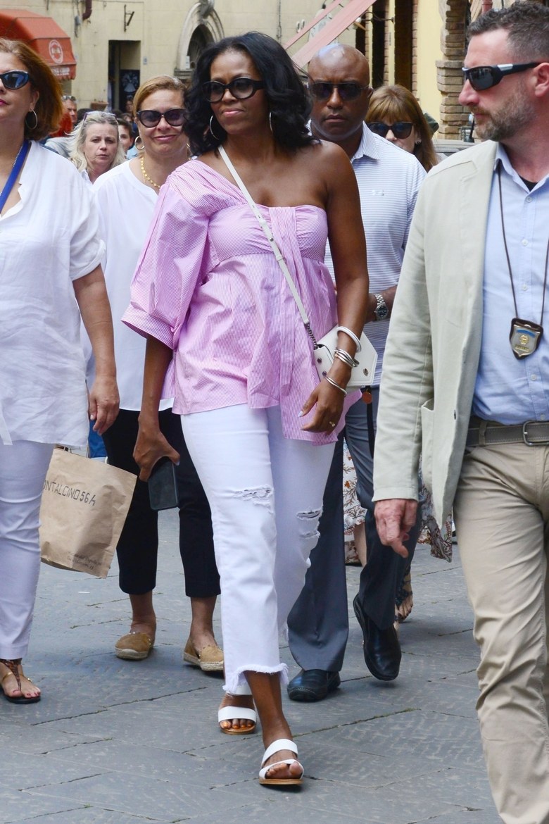 The former First Lady paired her top with white AG denim jeans and a white Jimmy Choo purse.