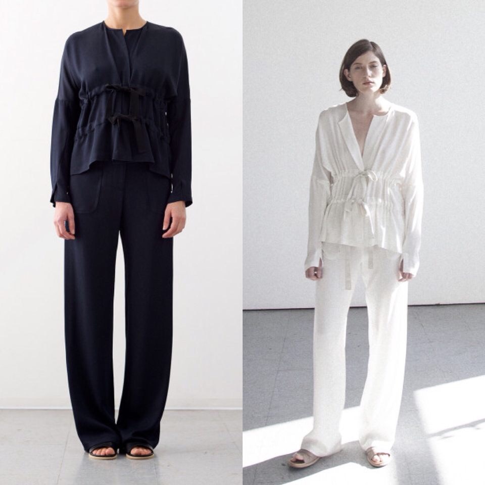 The top and pants are both made of woven twill material. The top gathers at the waist and the wide leg pants feature front pockets.