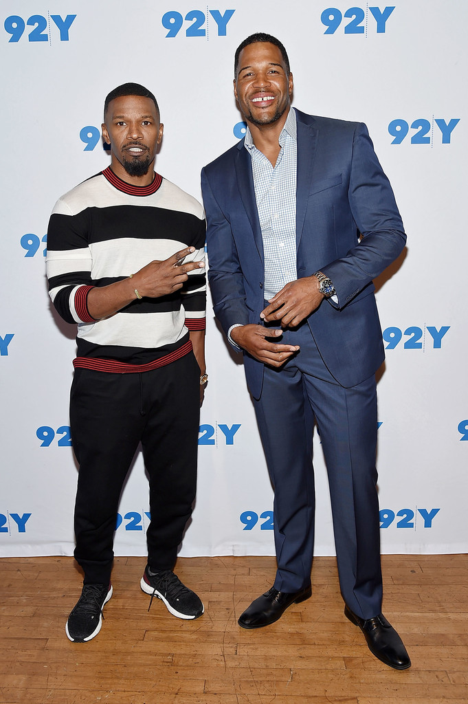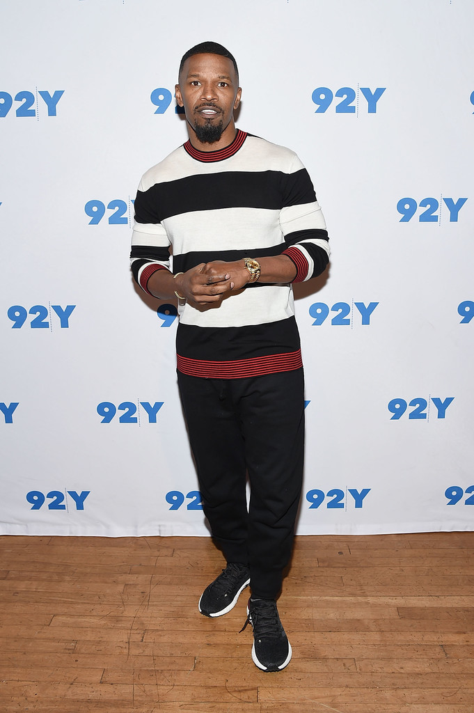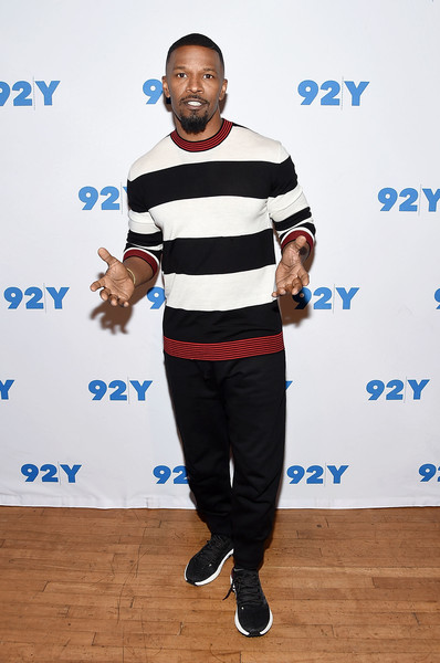 Jamie Foxx sat down with Michael Strahan for the 92nd street Y’s Conversations Event, with Jamie dressed in a $330 Alexander McQueen Striped Sweater: