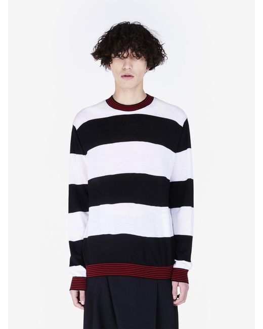The long-sleeved, lightweight wool sweater features large black and white striped design, with contrasting black and red ribbed collar, hem and cuffs.