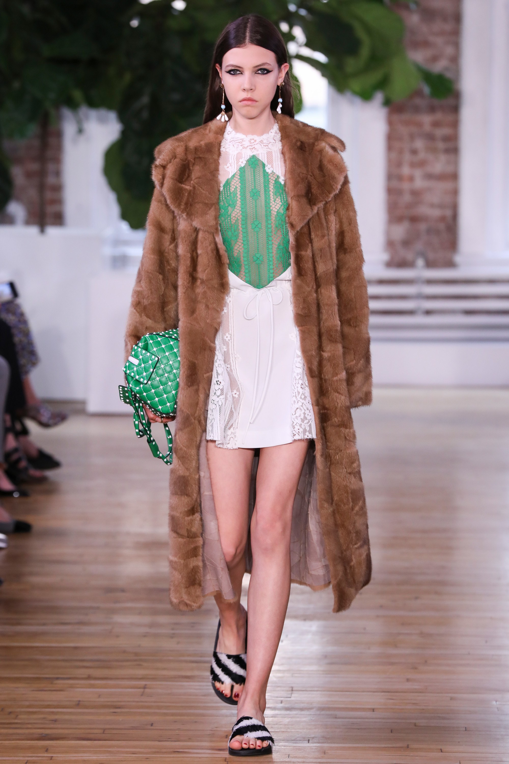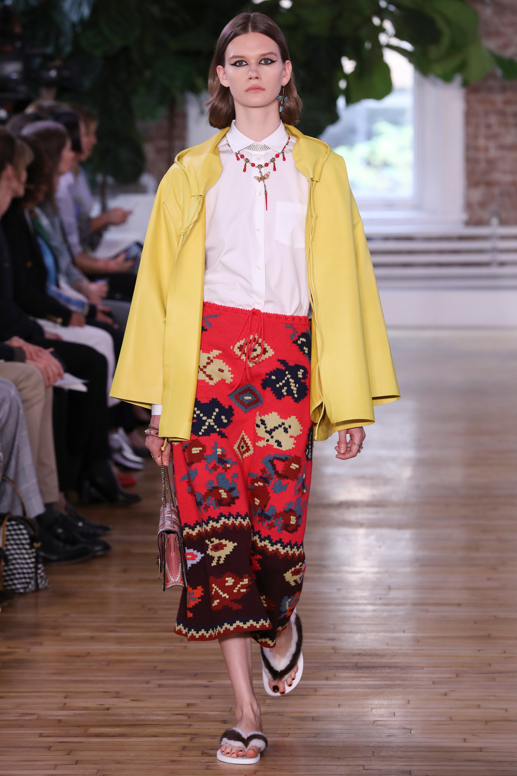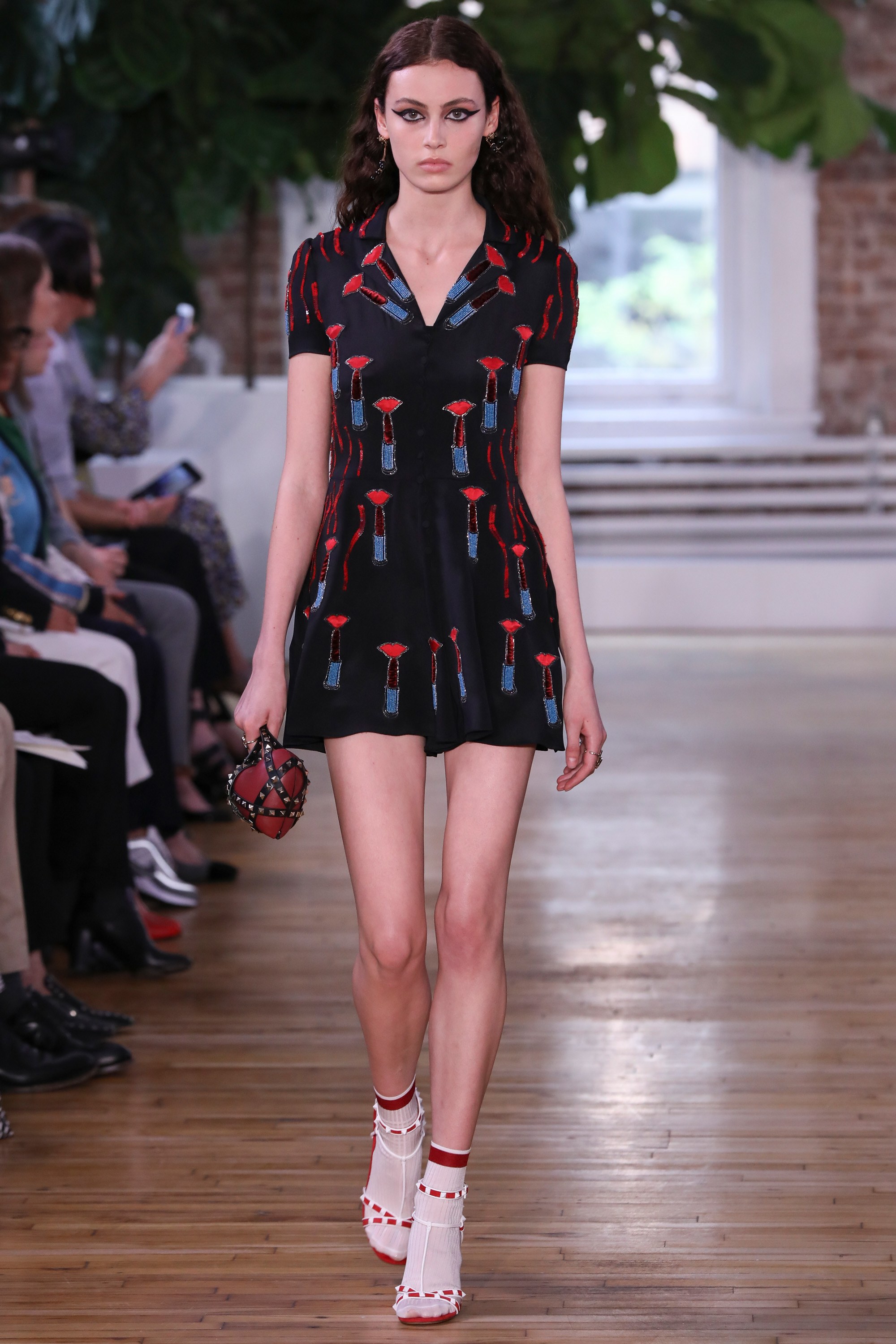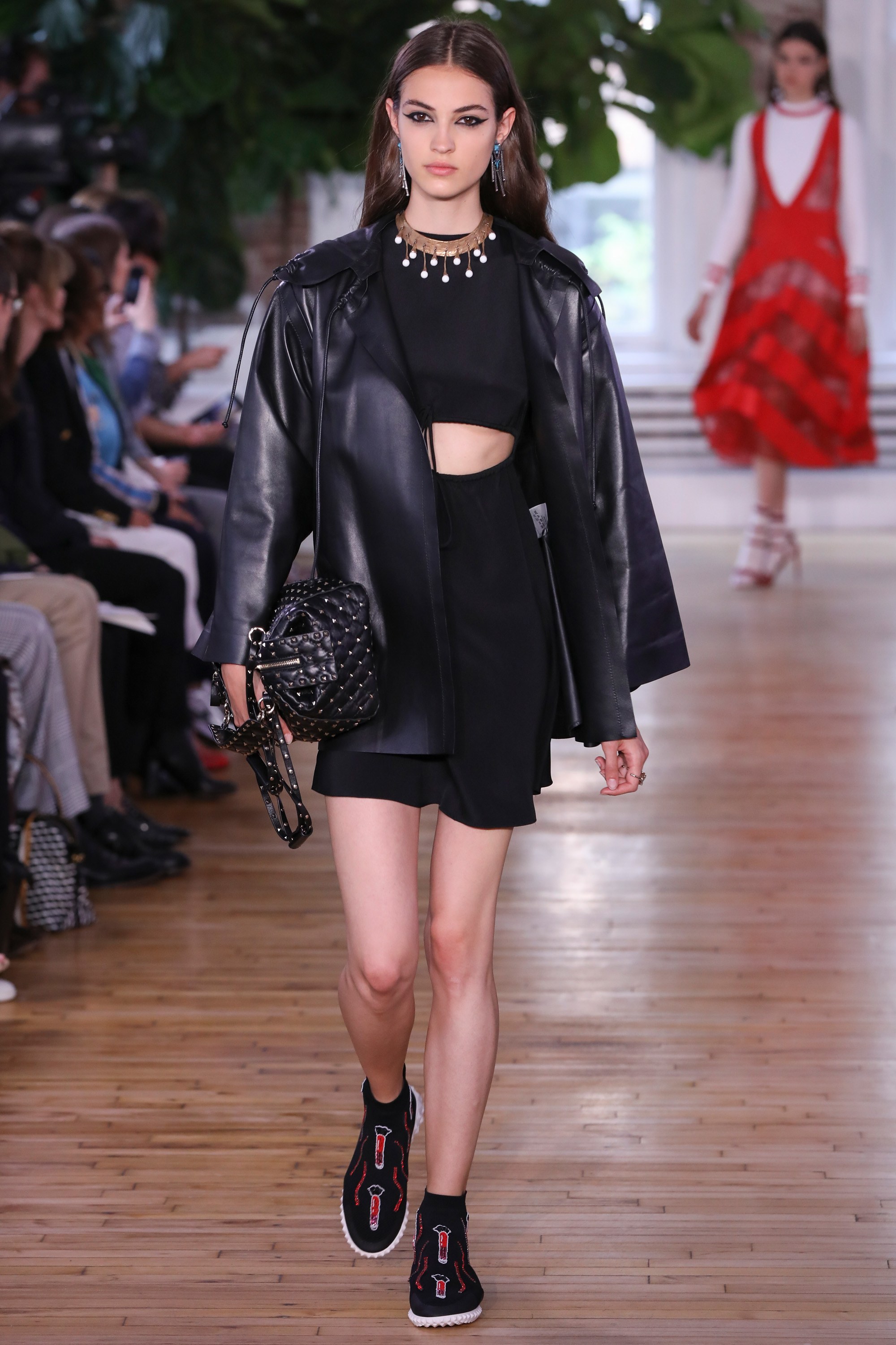 Outerwear was poignant and spoke to real-time wear when this collection drops in October. An oversized leather jacket was paired with a cutout LBD and sneakers for a touch of downtown cool and a colorful, calf-grazing embroidered coat gave a neutral getup a complete upgrade.