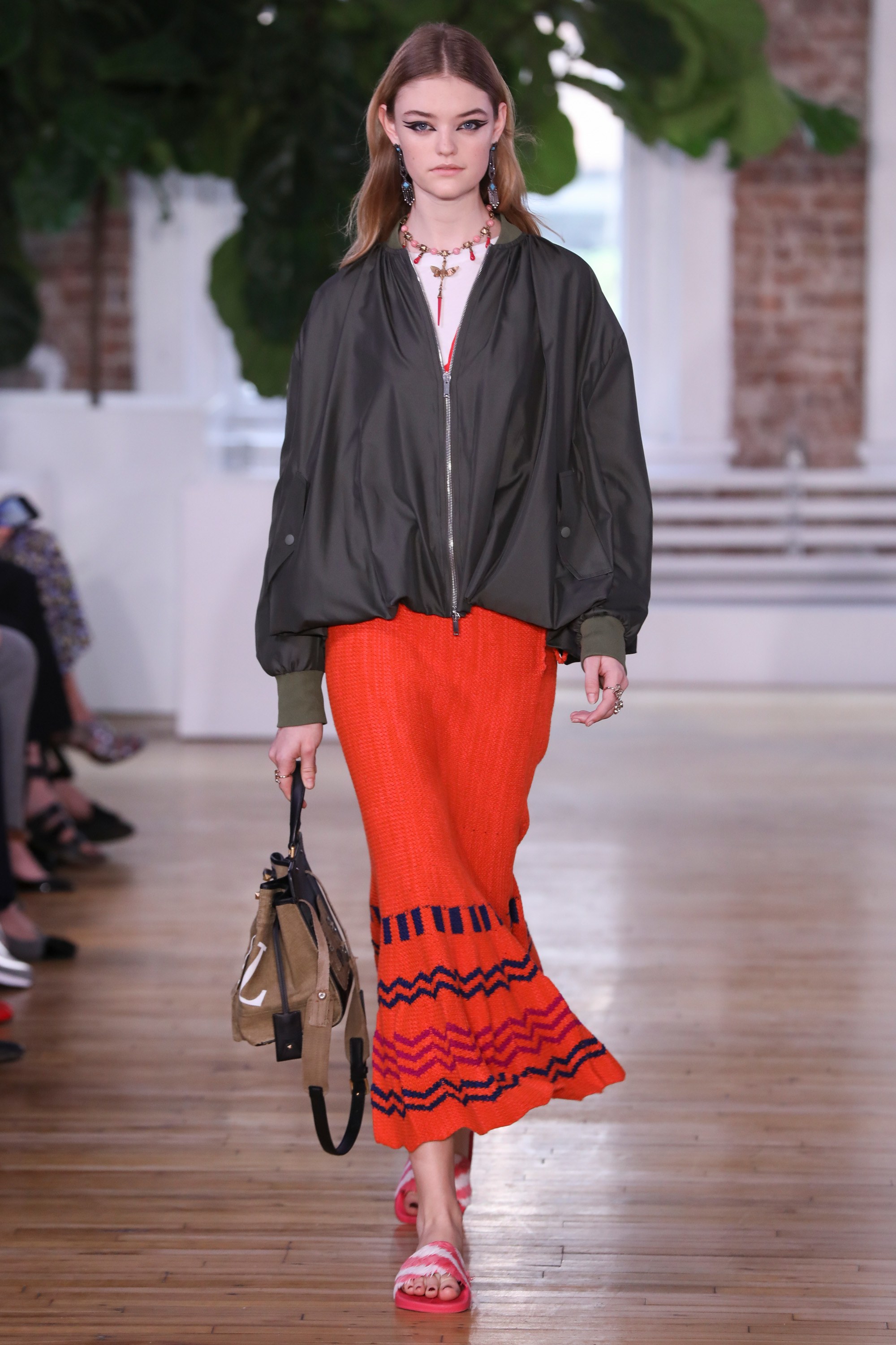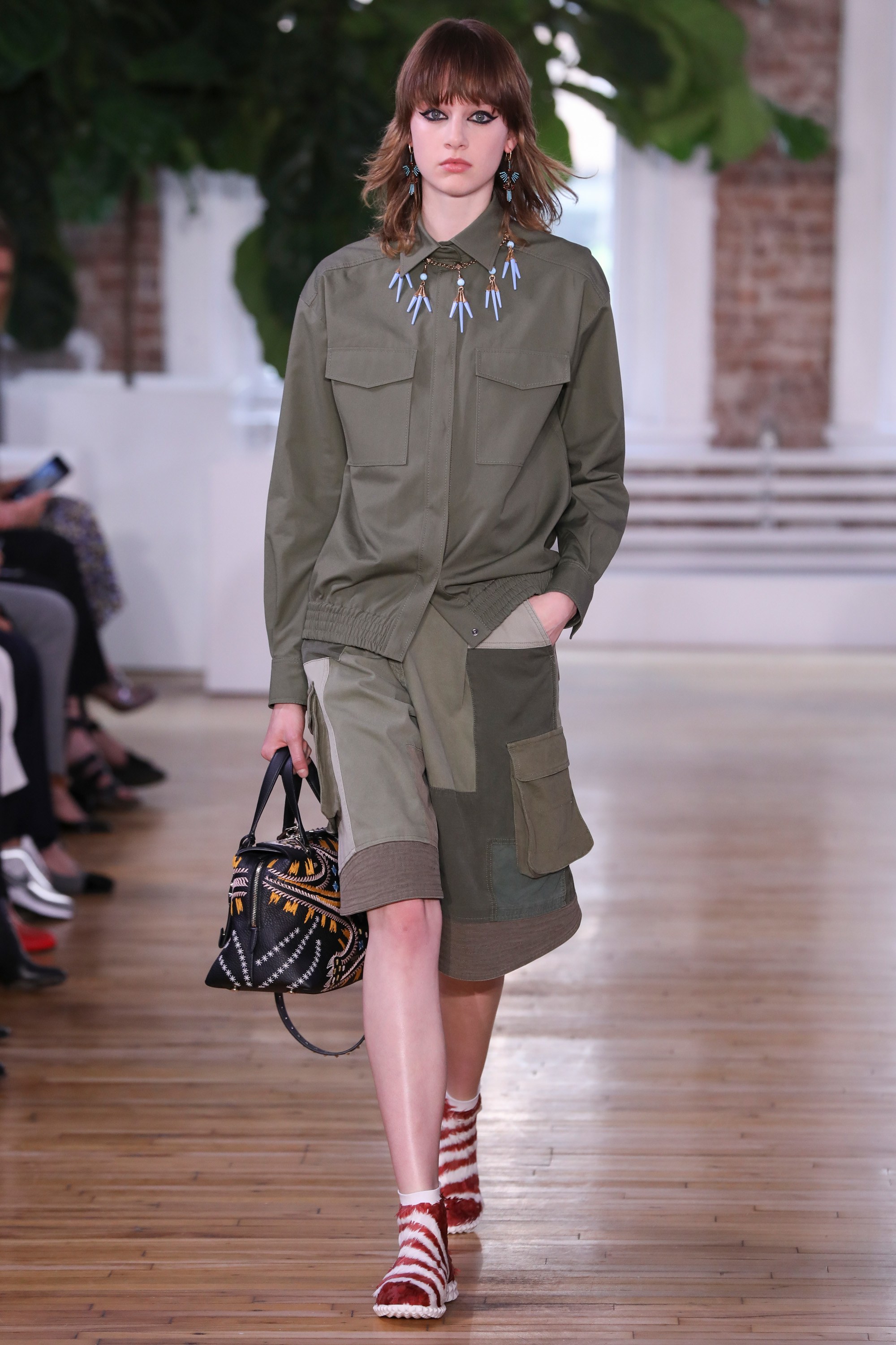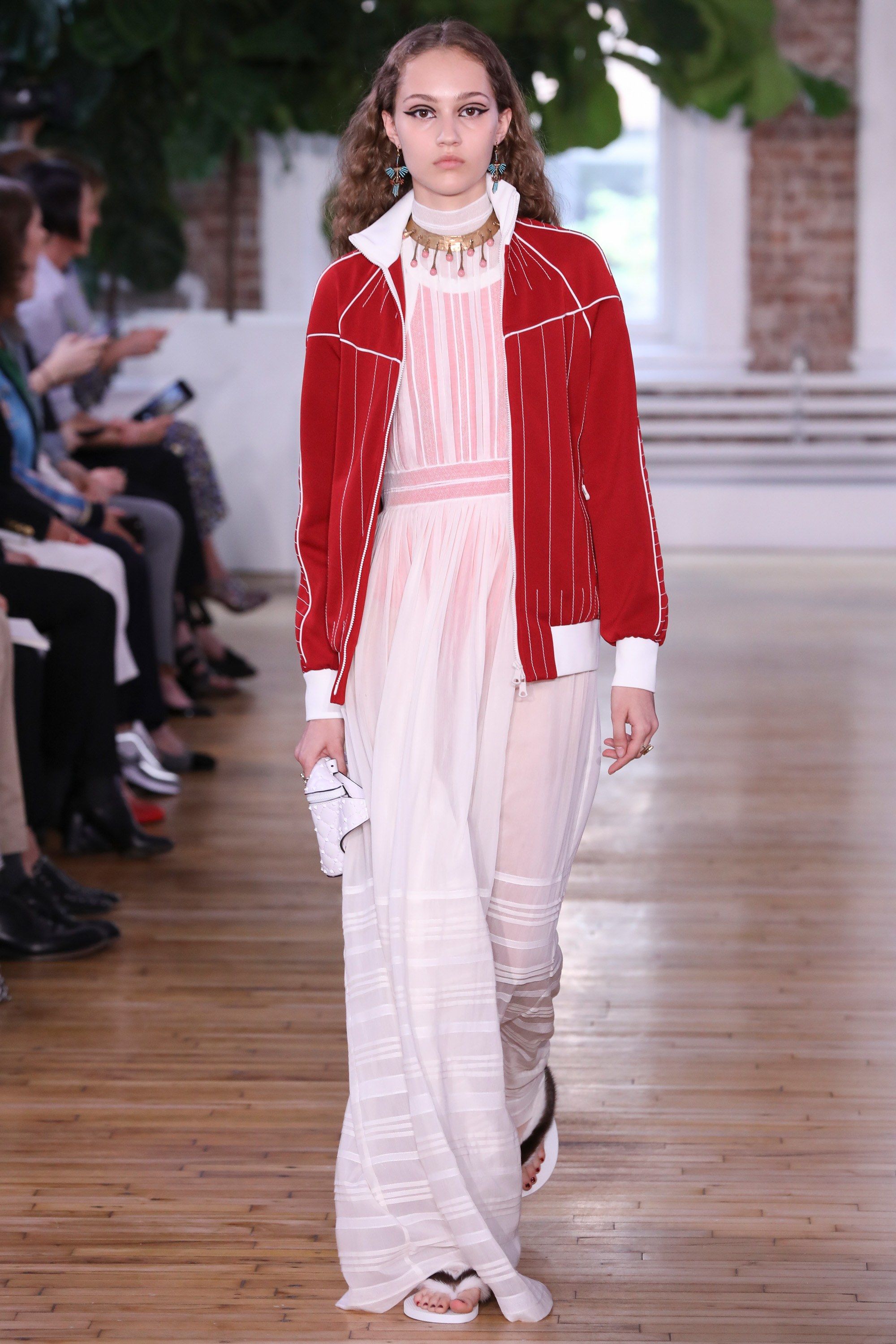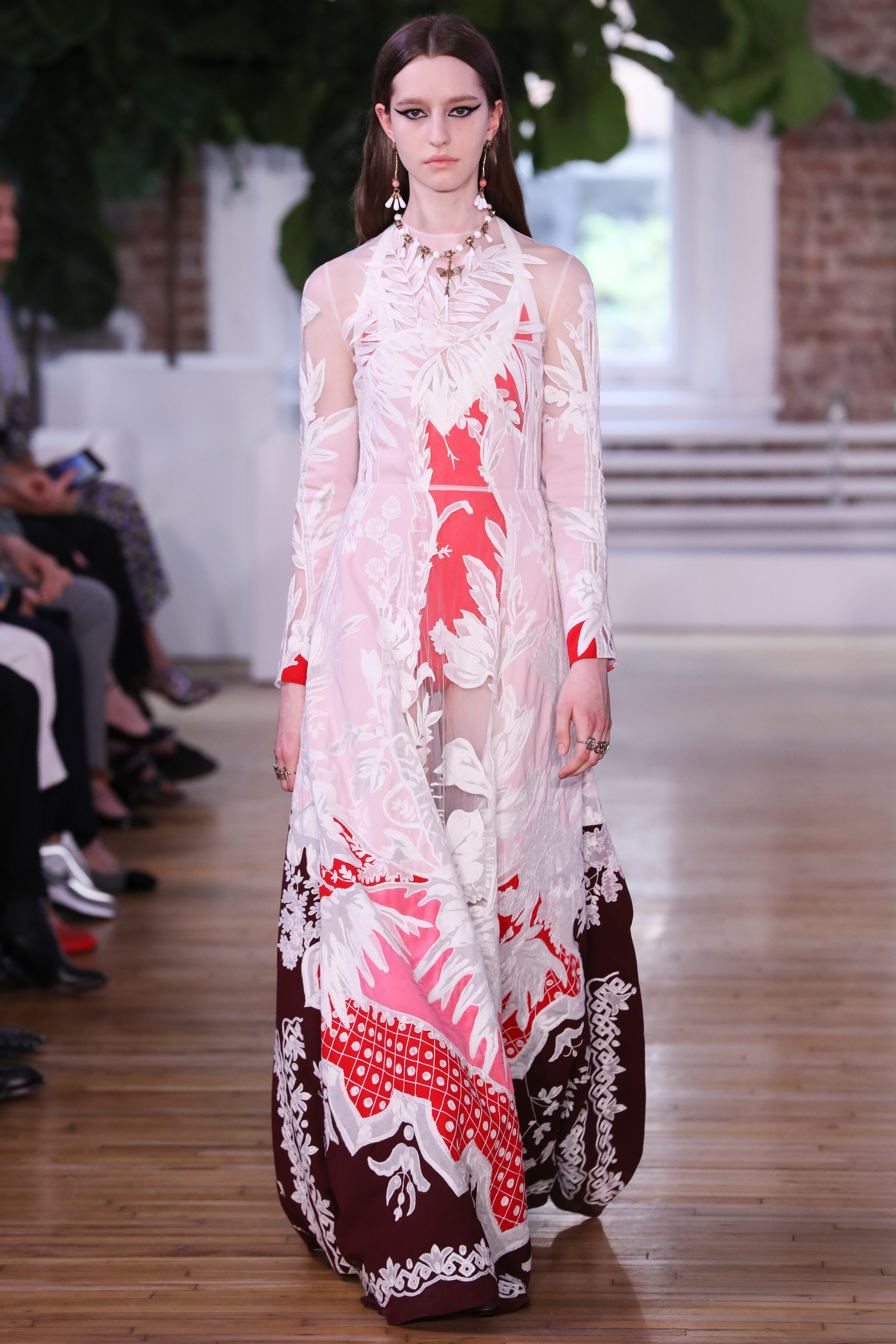 Outerwear was poignant and spoke to real-time wear when this collection drops in October. An oversized leather jacket was paired with a cutout LBD and sneakers for a touch of downtown cool and a colorful, calf-grazing embroidered coat gave a neutral getup a complete upgrade.