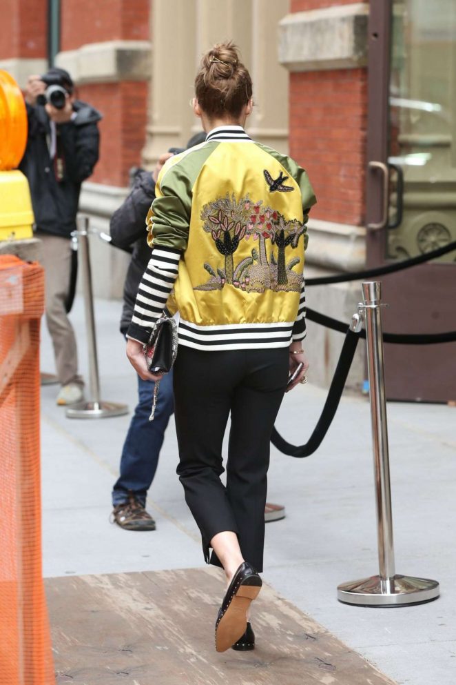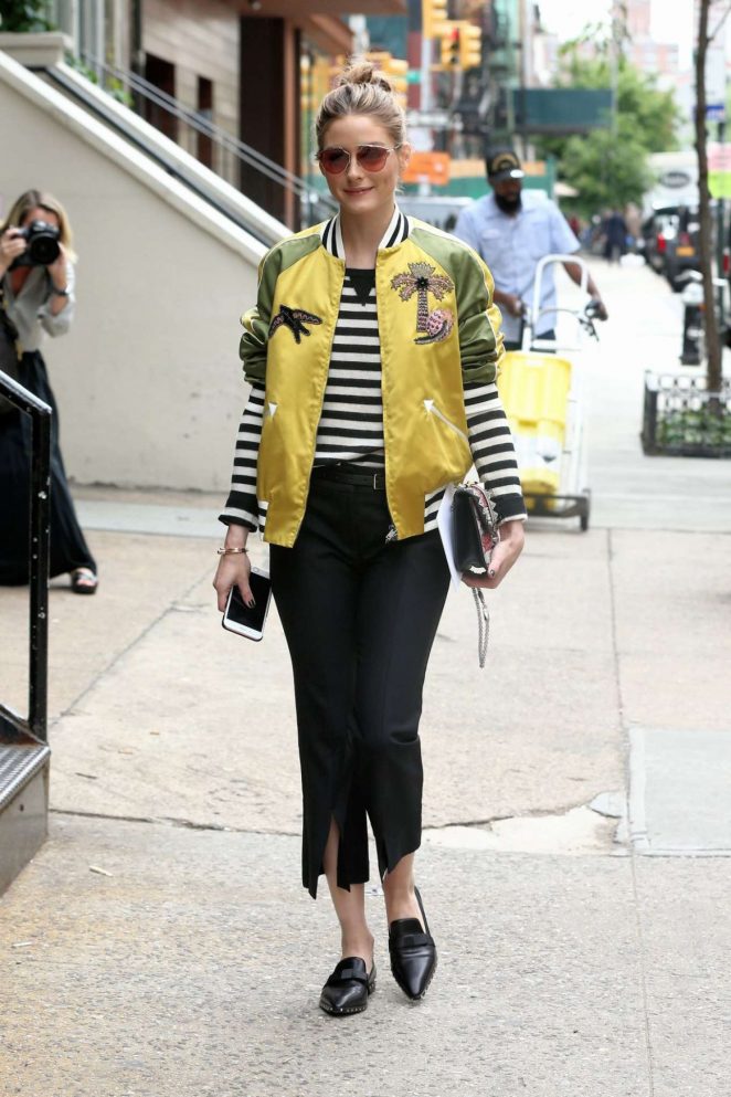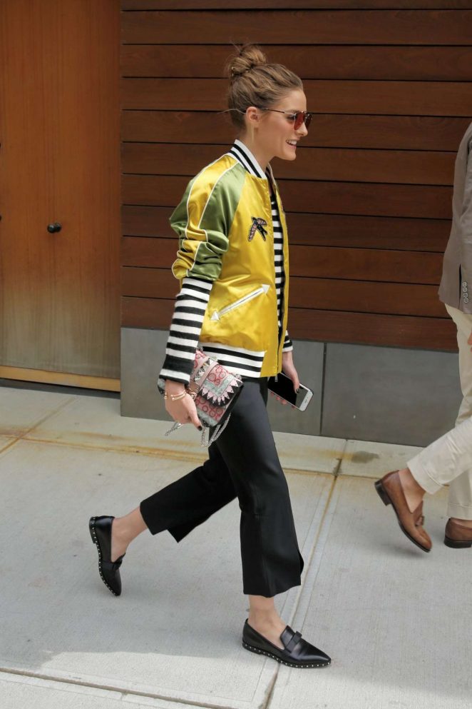 Olivia Palermo took in the latest Valentino show, clad in the iconic Italian fashion house’s $4,980 Tropical Dream Satin Bomber Jacket, $995 Black Soul Rockstud Leather Loafers, and $451 Alexis Black Mima Pants: