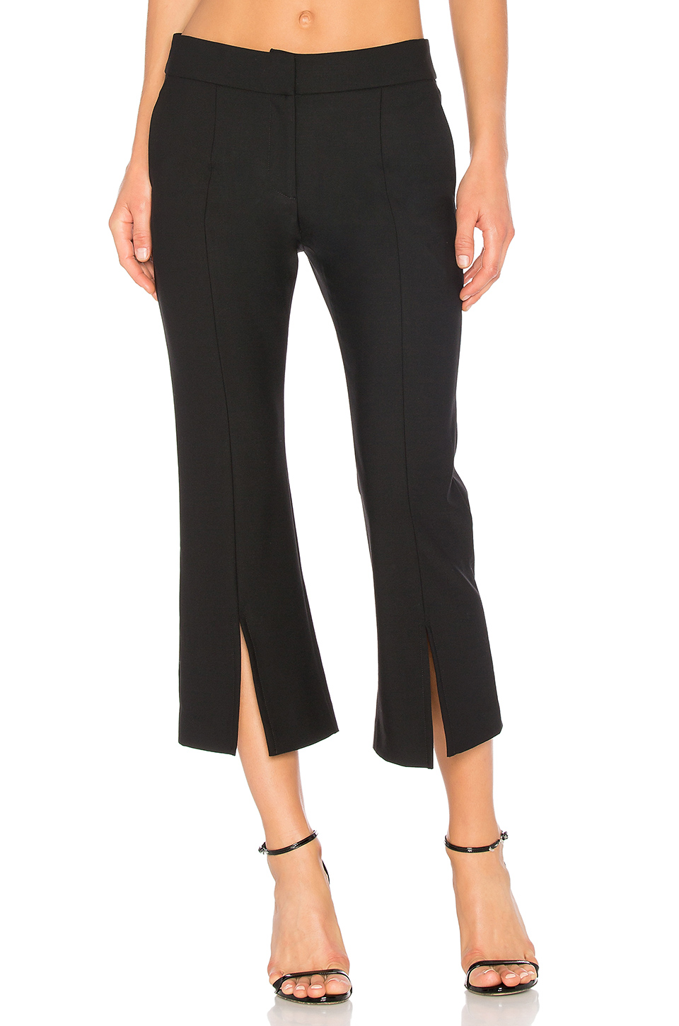 Her black trousers feature a high-waist, front slits, a zipper and hook front closure, and front slant pockets.