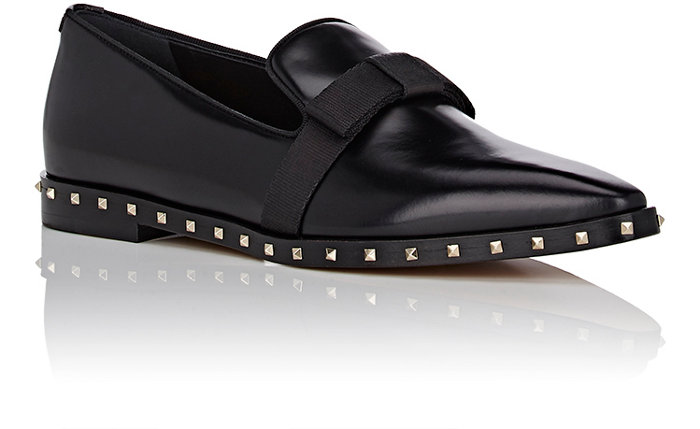Her black leather loafers boast webbed bow accents, a pointed-toe silhouette, functional 3/4″ stacked heels, and pale gold-tone micro-pyramid stud embellishment.