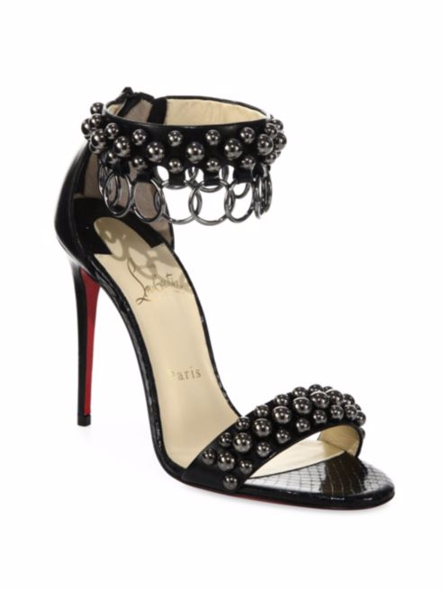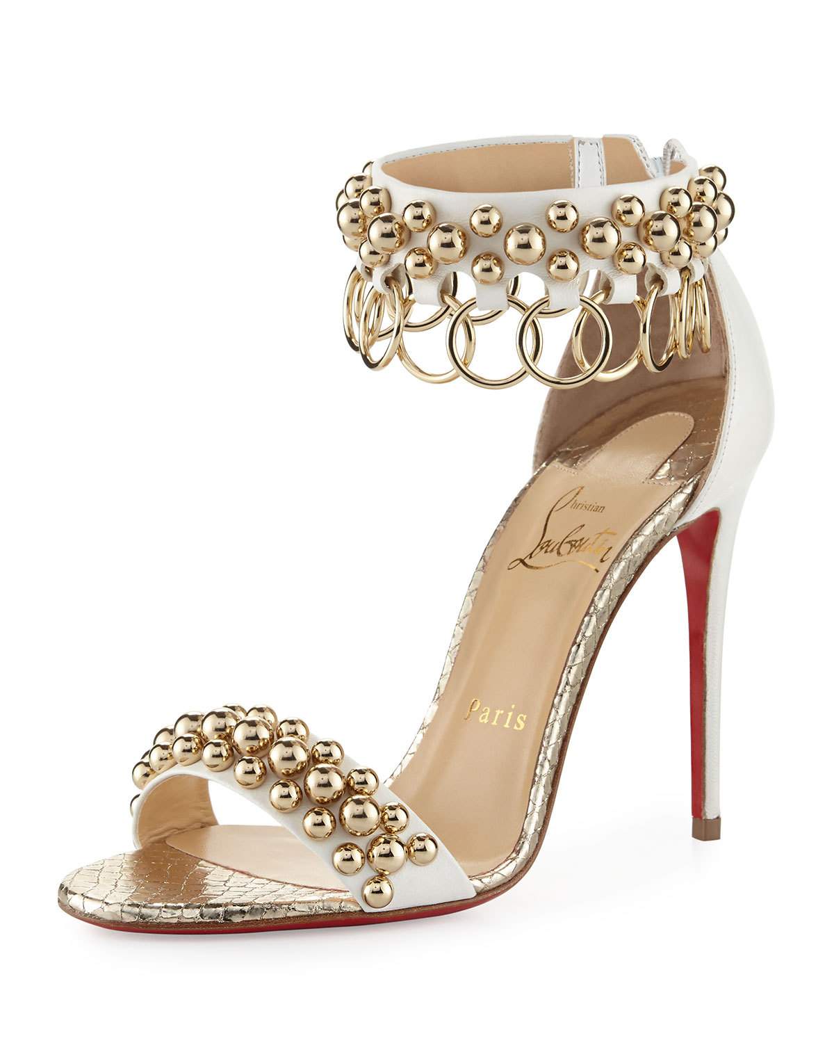 The studded napa calfskin sandal has a 4″ covered heel and an ankle strap with ring trim.