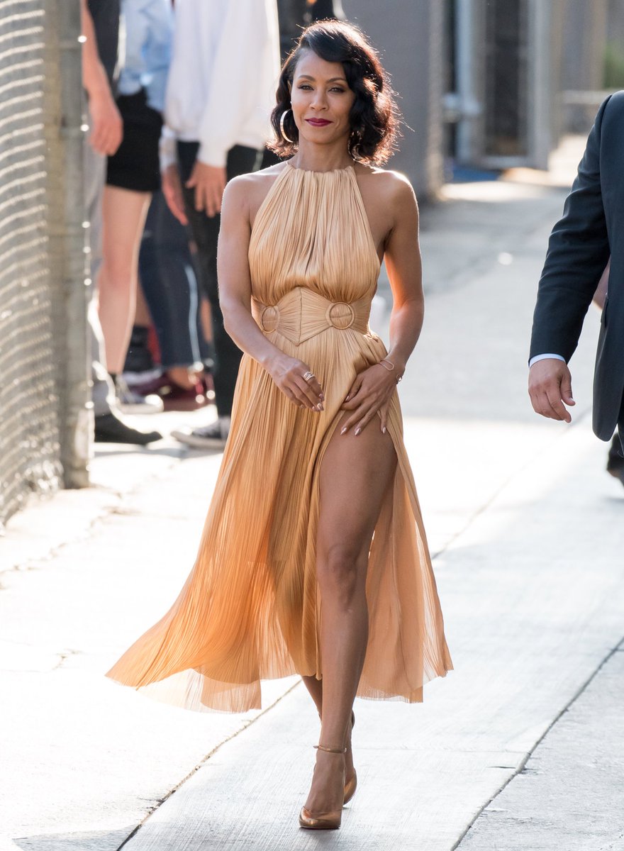 Jada Pinkett Smith sizzled for an appearance on Jimmy Kimmel Live, flaunting her toned gams in a $2,210 Maria Lucia Hohan Chalaya Slit Dress: