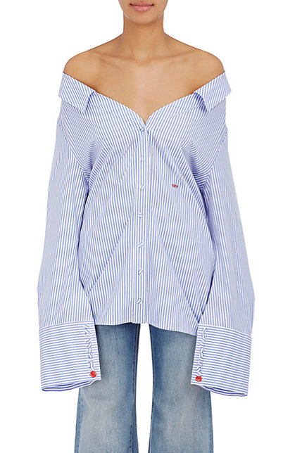 Cut with an off-the-shoulder neckline, the blue and white striped cotton poplin shirt is embroidered at the chest with red “Off” lettering and designed at the back with self-ties.