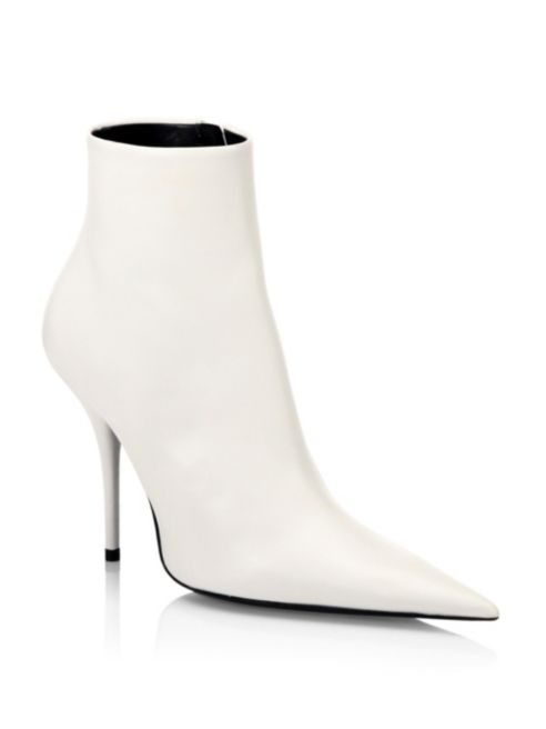 Balenciaga’s pointed-toe ankle boots are constructed of white grained leather and feature an extreme flat pointed toe and an ice pick heel.