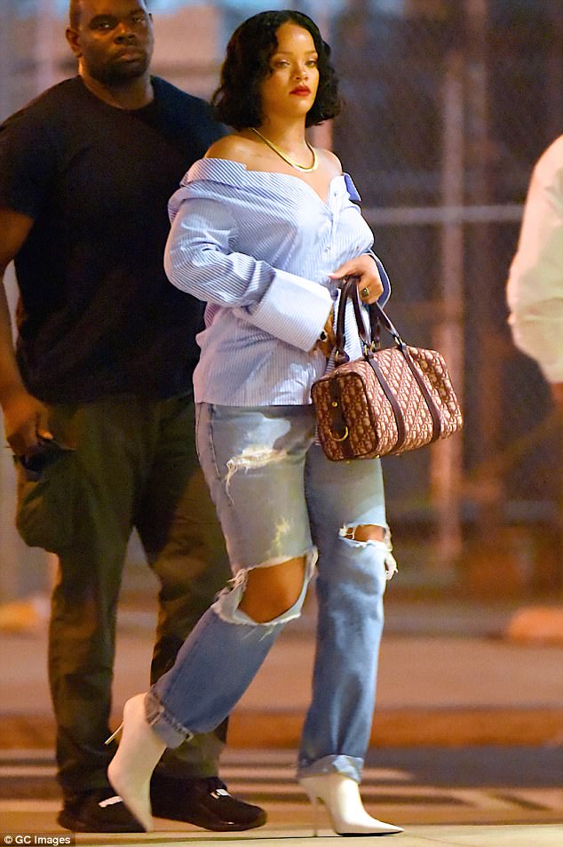 Rihanna showed off her street style while strolling in New York clad in a $665 Off White Off-the-Shoulder Striped Shirt and $1,015 Balenciaga Boots: