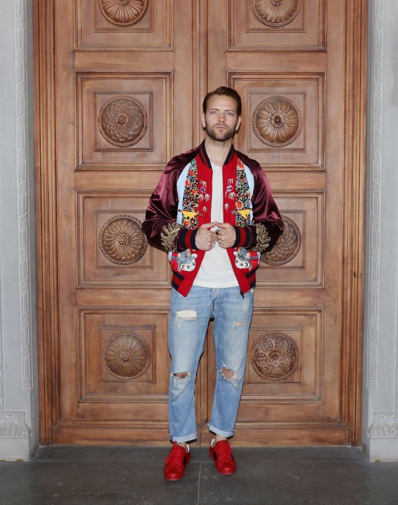 Alessandro Borghi kept it casual in a Gucci DIY embroidered bomber jacket, a white cotton t-shirt, and a pair of red leather Ace sneakers.