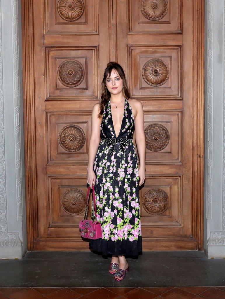 Dakota Johnson blessed the event wearing a Gucci Fall 2017 floral jacquard sleeveless dress with a plunging neckline. She completed her look with a pink velvet embroidered GG Marmont bag.