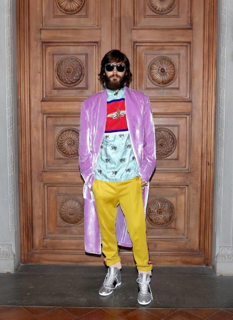 Jared Leto made a colorful statement in a Gucci Fall 2017 lavender velvet robe with a blue and red silk shirt, yellow trousers and silver high top sneakers. Ok, Jared!