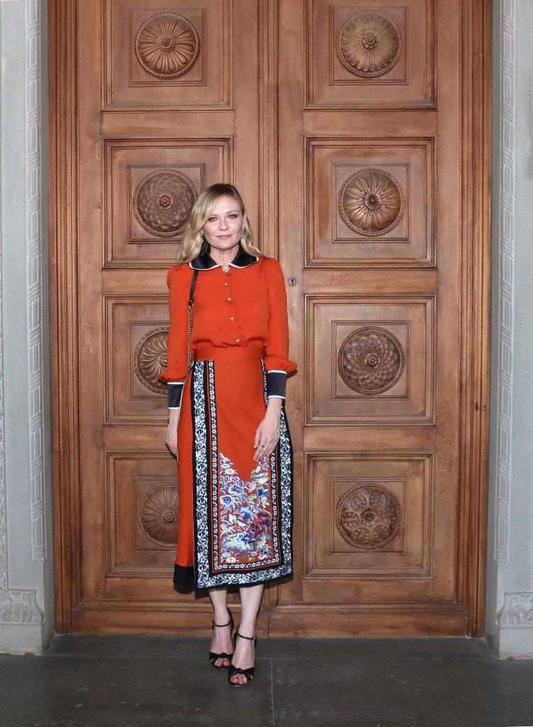 Kirsten Dunst hit the Cruise Fashion show rocking a Gucci Spring 2017 orange blouse and an orange pleated embroidered skirt.