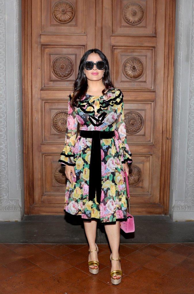 Salma Hayek Pinault looked graceful in a Gucci Fall 2017 long sleeve floral printed dress carrying a pink velvet embroidered GG Marmont bag and rocking gold platform sandals.