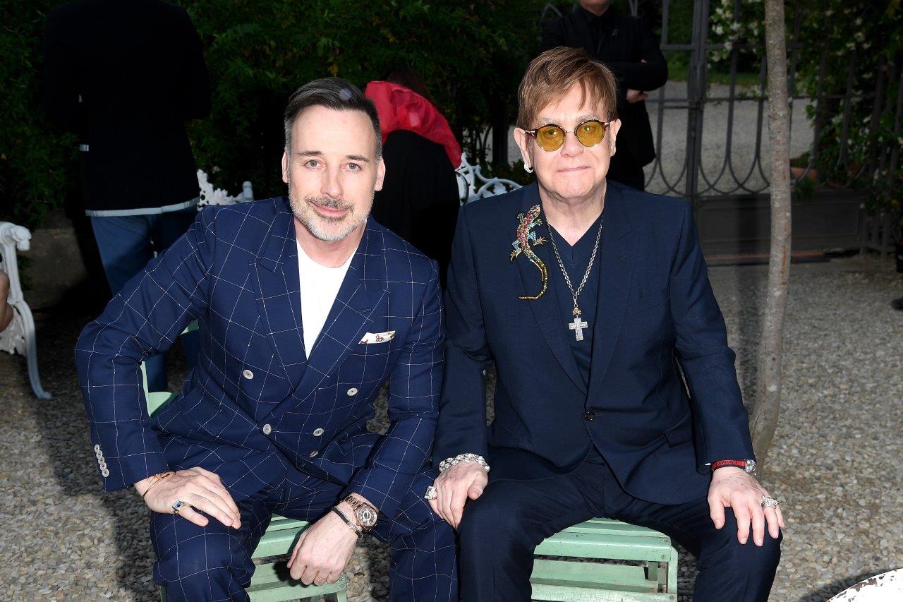 Sir Elton John was royal in a Gucci DIY Signornia suit with a crystal lizard on the lapel. David Furnish was dapper in a Gucci Spring 2017 blue and white Signoria checkered suit.