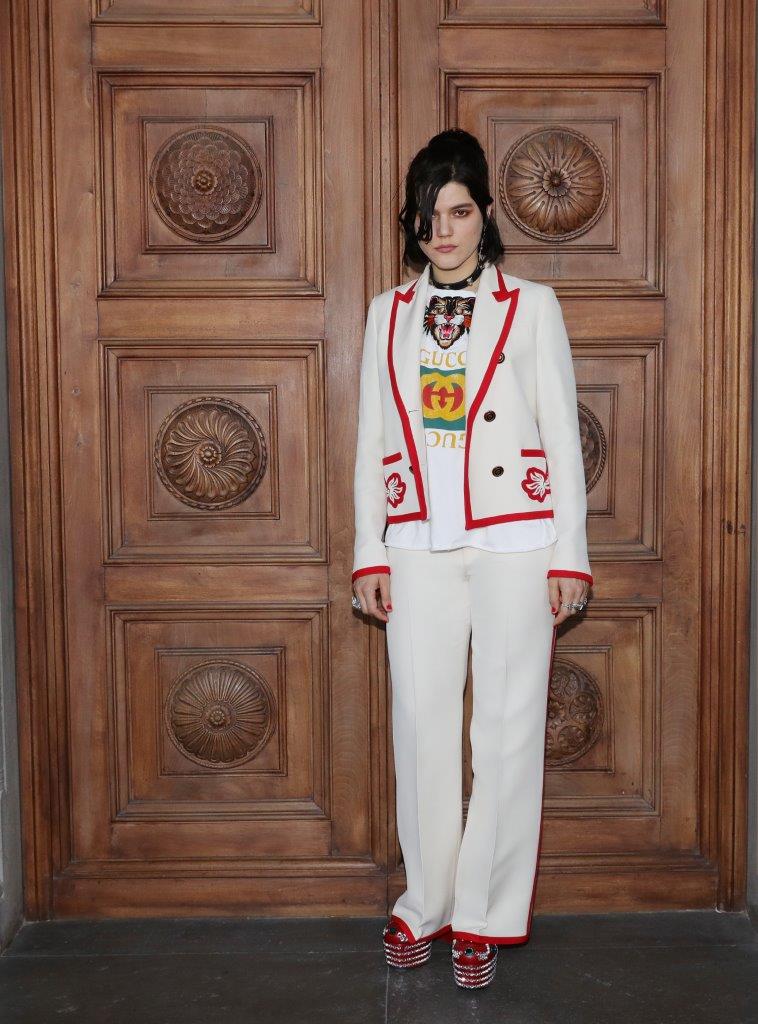 Soko graced the event in a Gucci Spring 2017 white, double breasted jacket, a Gucci t-shirt underneath, and matching pants.