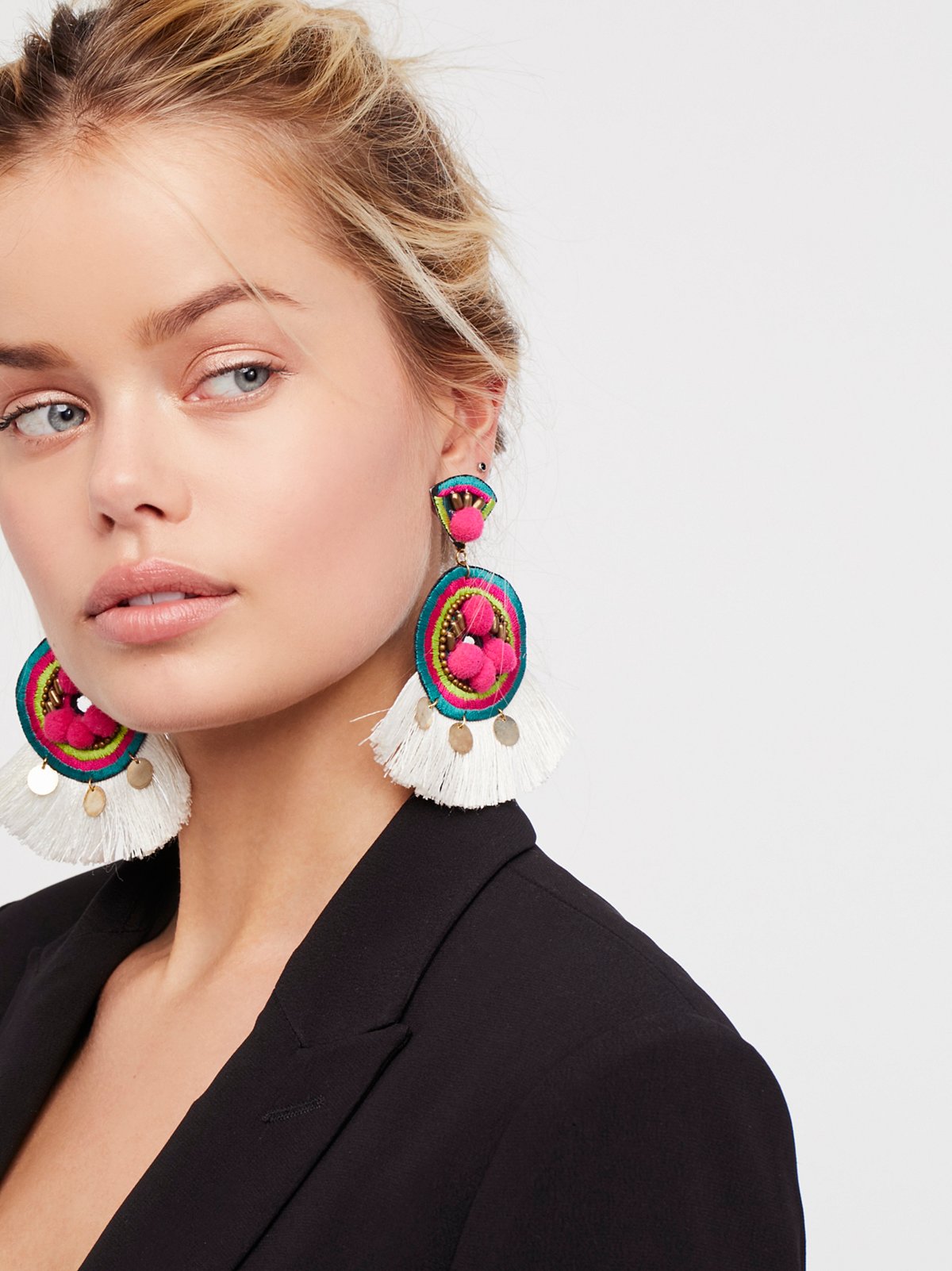Fringe trim, metal bead accents and pom poms make these affordable $38 Mai Tai statement earrings uber irresistible.
