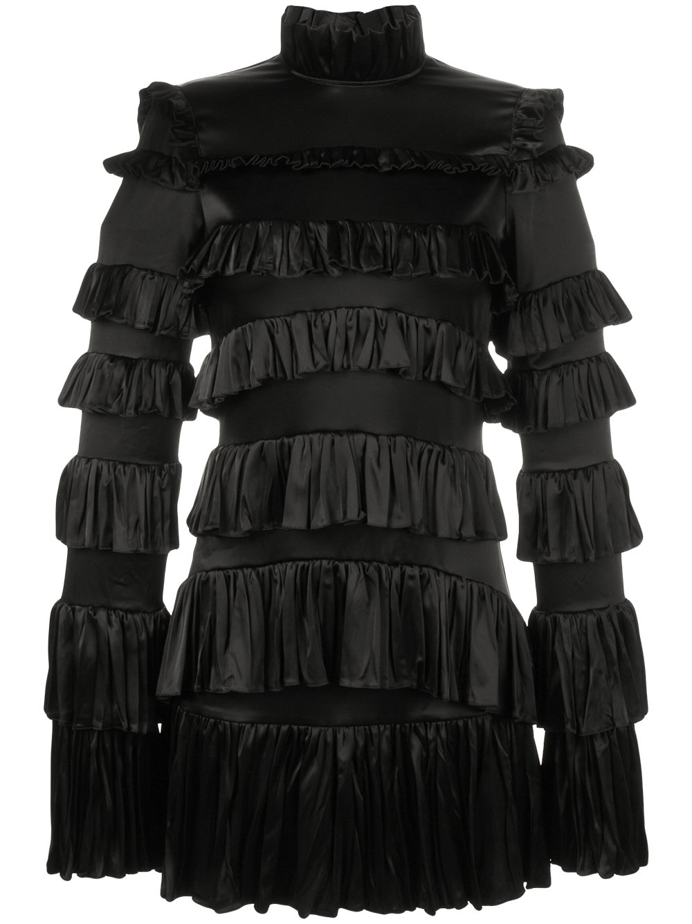 Her dress features allover ruffle detailing, a high neck, long sleeves, and mini length.