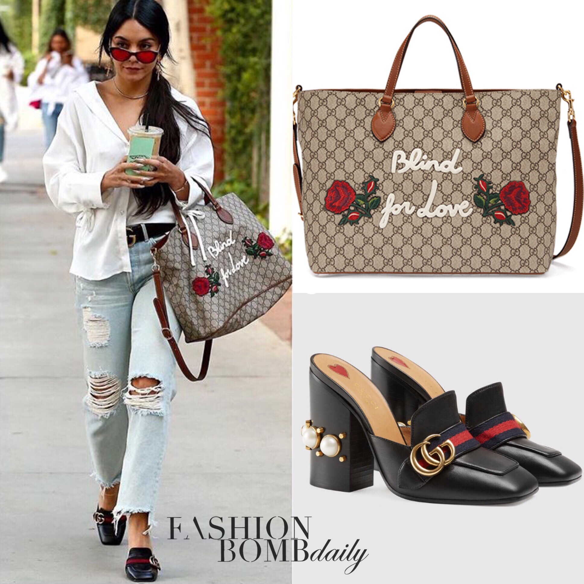 Vanessa Hudgens was spotted in West Hollywood grabbing an ice cold beverage from Alfred Coffee. The High School Musical star did not let a day off keep her from looking chic as ever. She wore an oversized blouse from Storets tucked into a pair of light blue distressed jeans belted with- you guessed it- Gucci’s leather belt with double G. She accessorized her look with Gucci’s sold out Blind for Love bag and the brand’s Leather Mules.