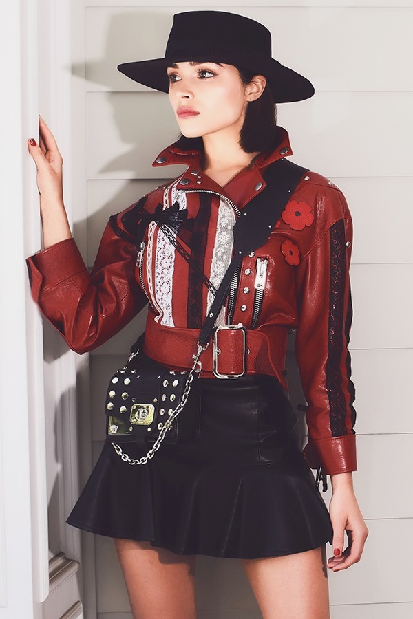 Her vegan leather skirt boasts a flounce hem and mini length.