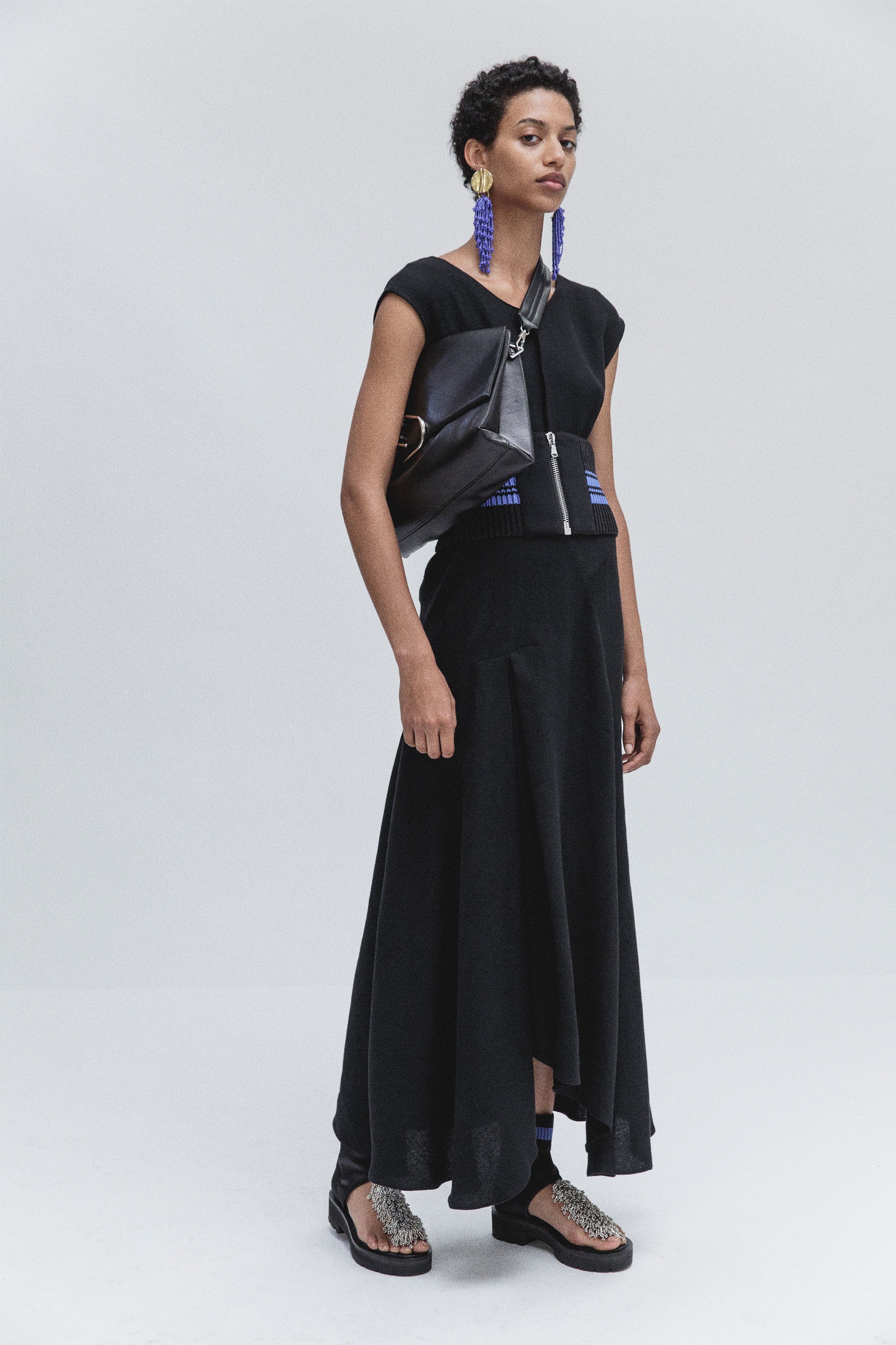 Accessories continued that tribal-inspired vibe with oversized drop earrings in bold hues and rope-accented sandals.