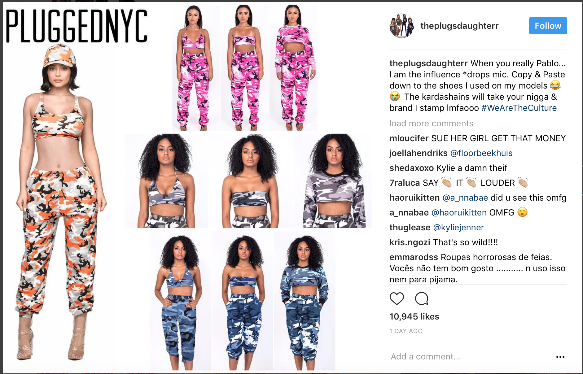 Tizita Balemlay, Creative Director of Plugged NYC claims that while she certainly didn’t create the two piece camo trend, she takes credit for bringing it back to life. Balemlay posted a photo to her personal Instagram of Kylie in her “Camo” collection next to her Plugged NYC models and said, “I am the influence *drops mic…” Plugged NYC has worked with celebrities like Rihanna, Keke Palmer, Kehlani and more. Tizita also shared emails between her and Kylie’s stylist, confirming that Kylie did know about her brand. While she did not send her any camo sets, she did send her tops.