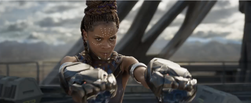 Letitia Wright, who plays Shuri, acts as Nakia’s battle partner. She wears a darker suit of armor with gloves and her face is full of tribal make-up.