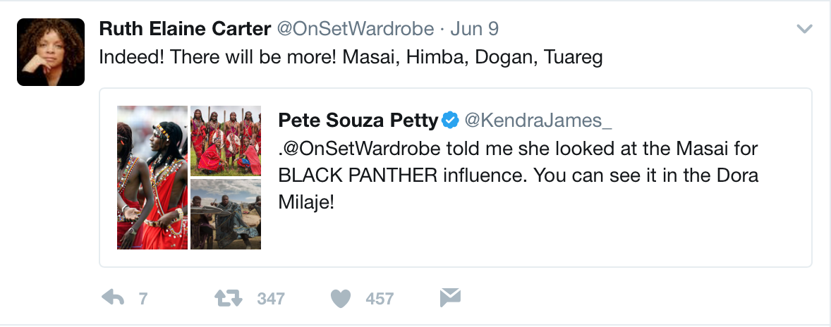 Ruth Carter @OnSetWardrobe is the costume designer behind all of the looks in Black Panther, and has already lent her talents to legendary films like Malcolm X, BAPS, Selma, and more. The renowned costume designer went to Twitter shortly after the trailer was released and said “it was important to make them heroic and tribal.“