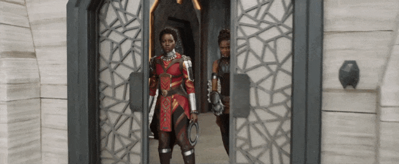 Lupita Nyong’o, who plays Nakia, is dressed in a similar red armor. With a clinched waist and gold and silver detailing, her character’s suit of arms looks as if it could almost be a dress.