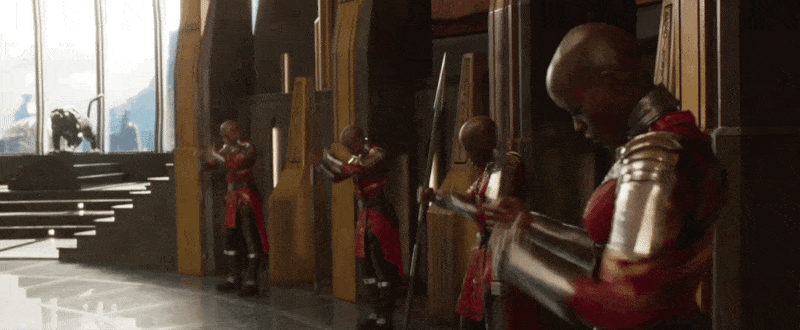 Armor is a prominent theme in the trailer. The Black Panther’s matte black armor, festooned with spikes on the chest, add an edgy aura to his fictional character.