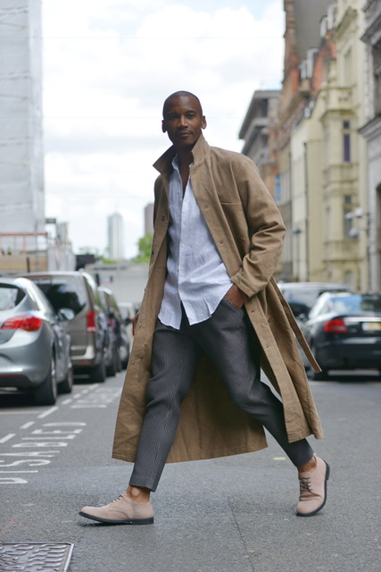 This dapper gentlemen casually took to the town in a classic trench coat.