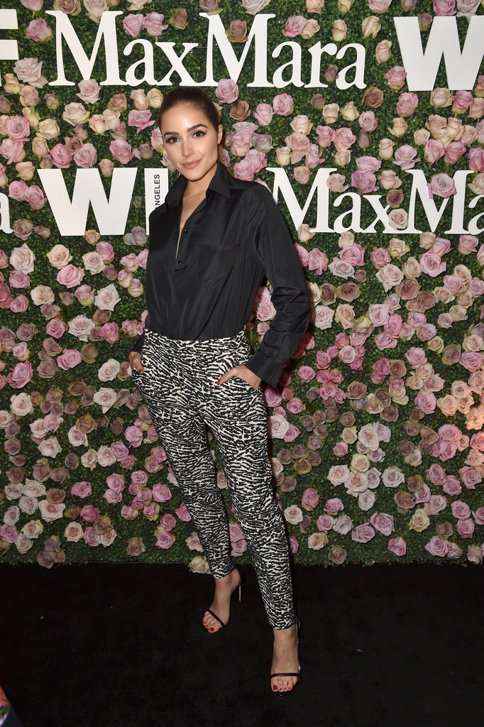 Olivia Culpo uplifted a classic black button-front shirt with printed trousers.