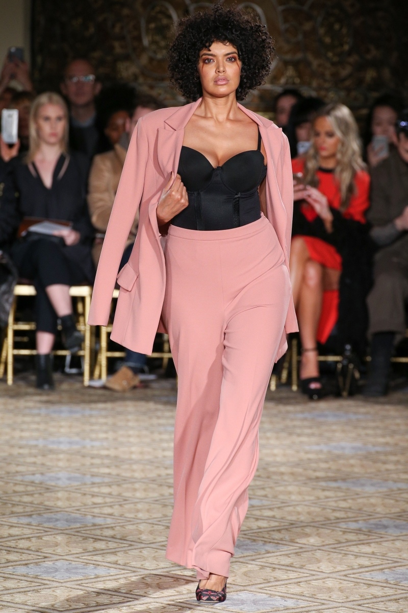 Lavern styled her salmon colored pant suit similar to the runway look. However, for extra flair, she added a corset belt and wore black heels.