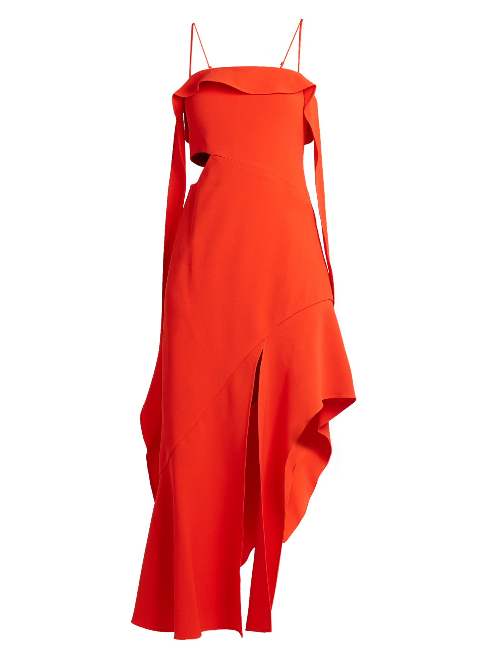 Her dress features a straight neckline, adjustable skinny shoulder straps, ruffle detailing, draped side panels, a cutout side accent, bias cut, asymmetric hem, and a centre front slit.