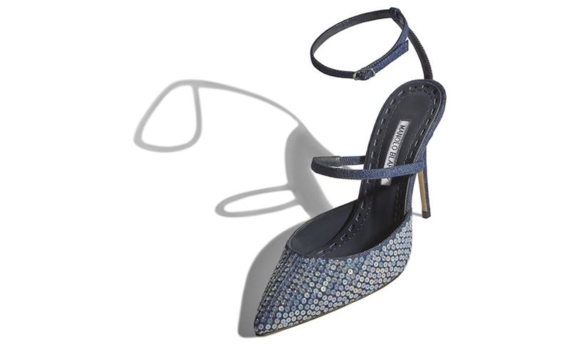 Her denim pumps are a part of Rihanna’s collaboration with Manolo Blahnik. They boast sequin embellishment, a pointed-toe silhouette, front straps, buckled ankle straps, and 4.1″ heels.