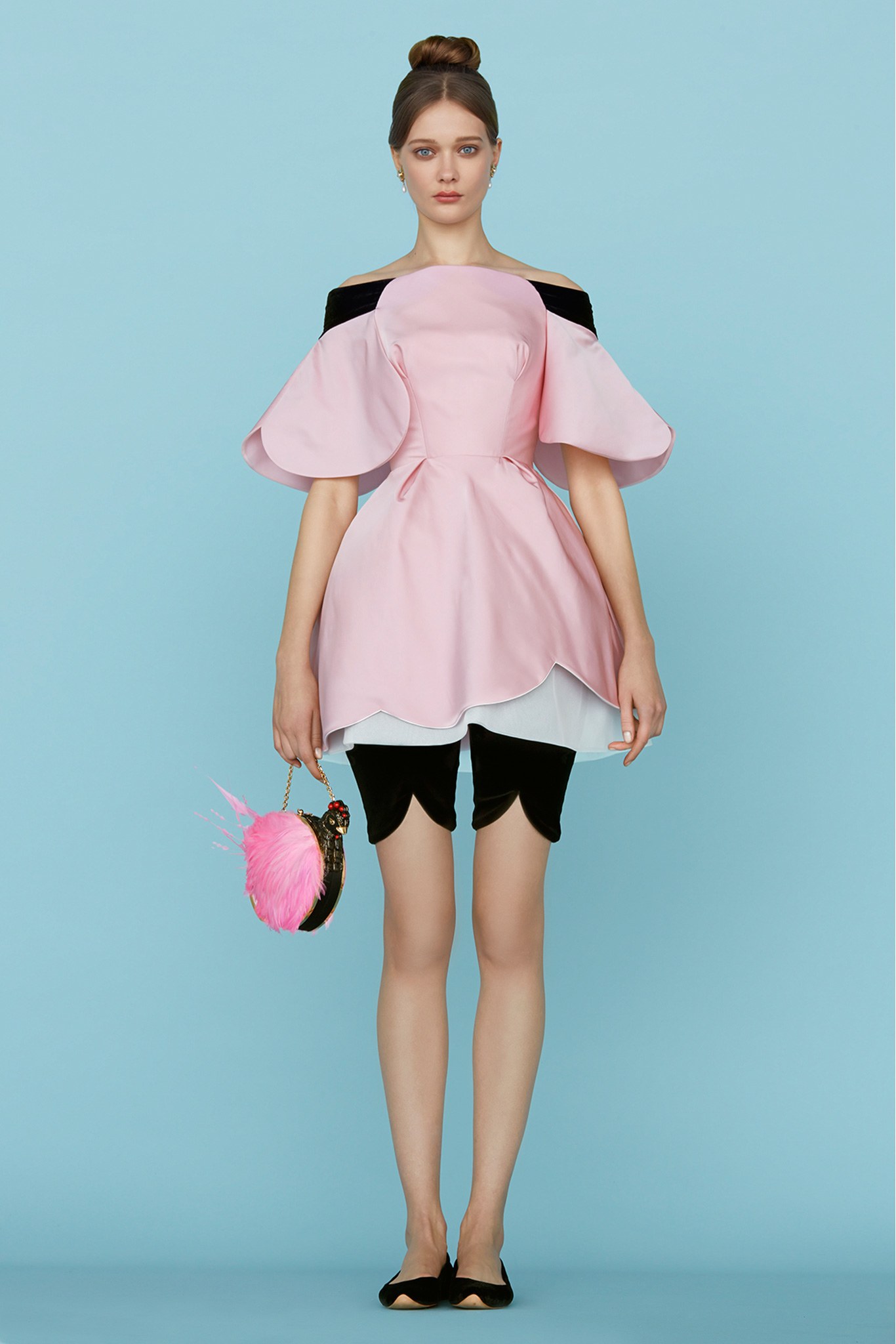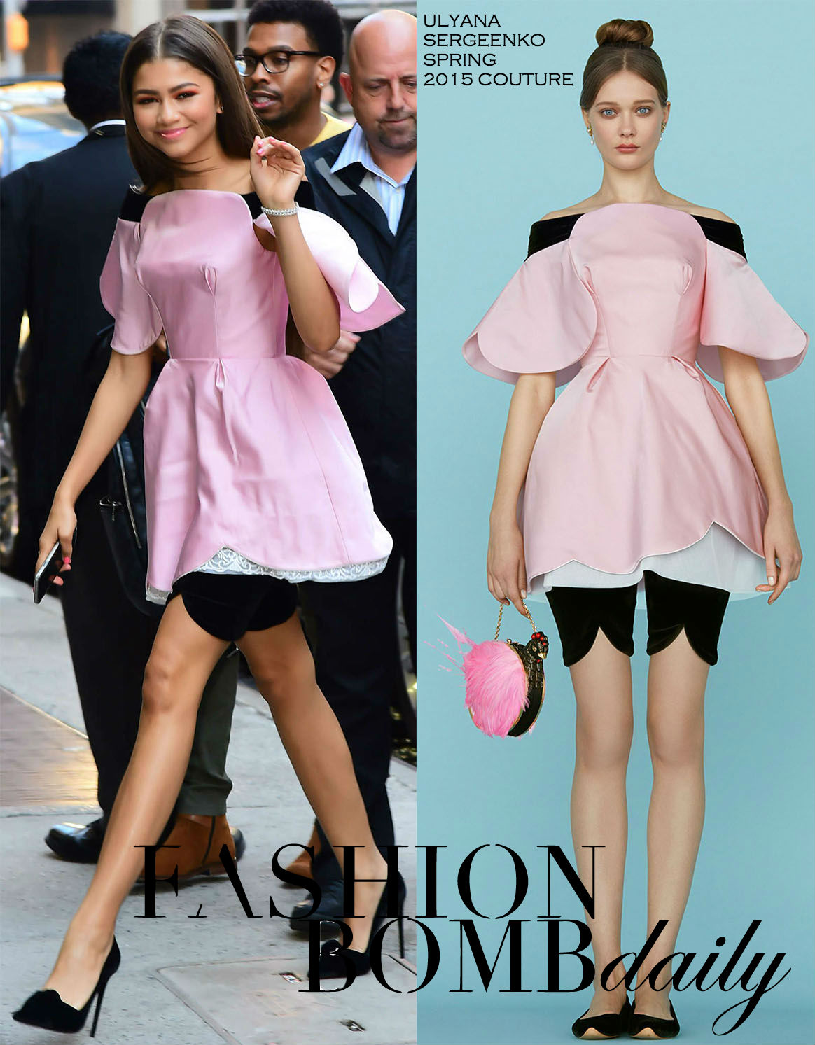 Zendaya was pretty in pink while making an appearance on Good Morning America, clad in an Ulyana Sergeenko Spring 2015 Couture Pink Off-the-Shoulder Mini Dress and Black Shorts: