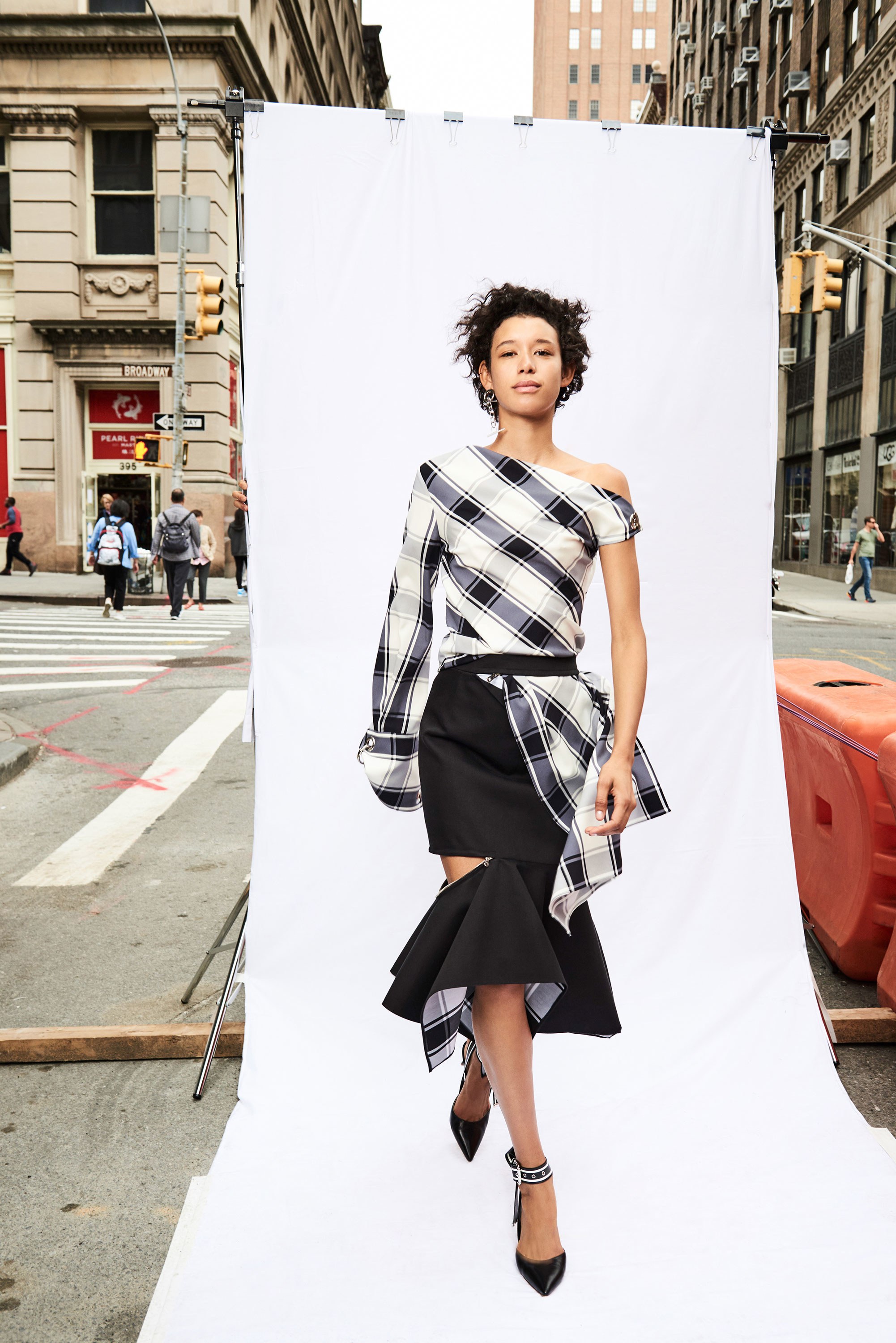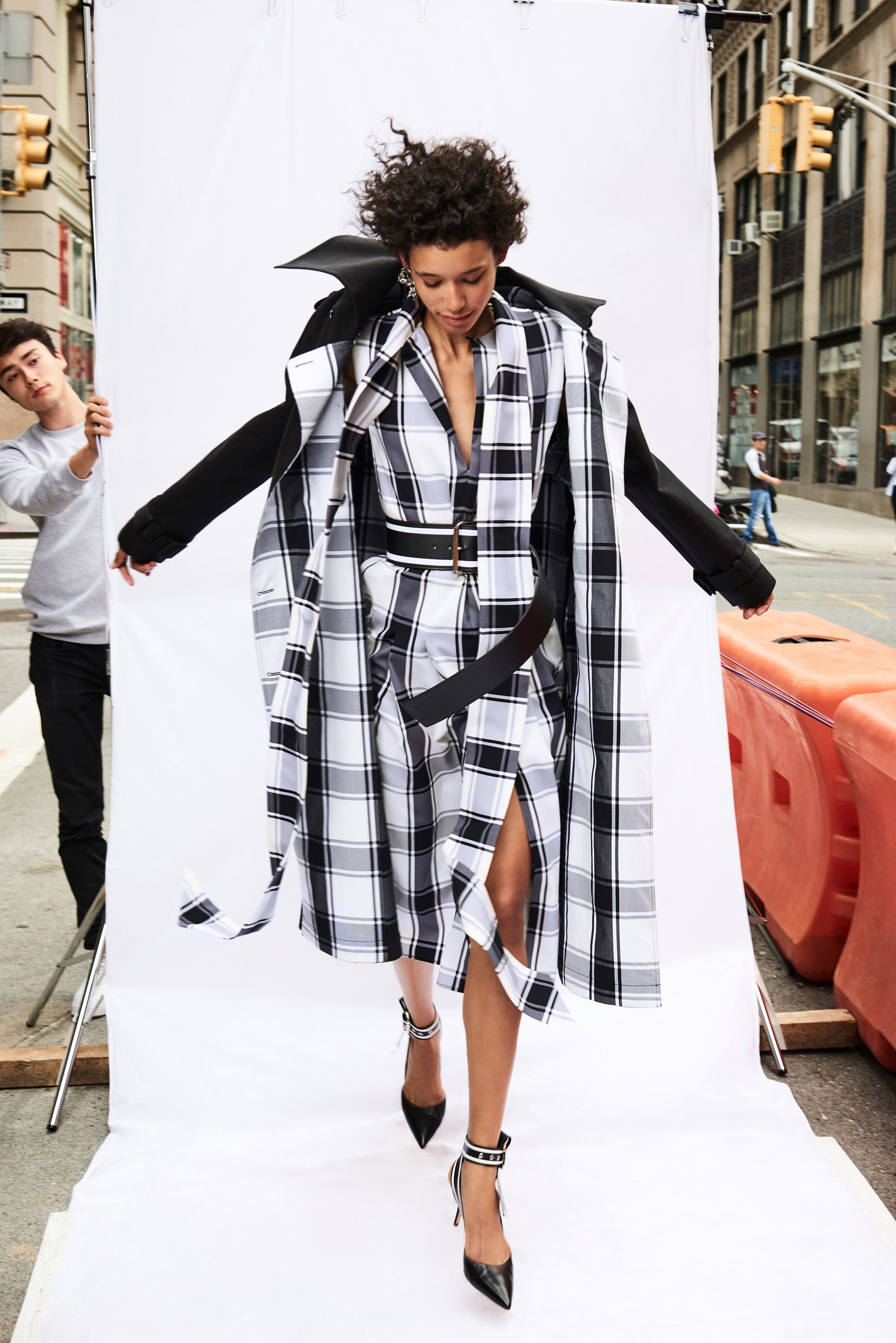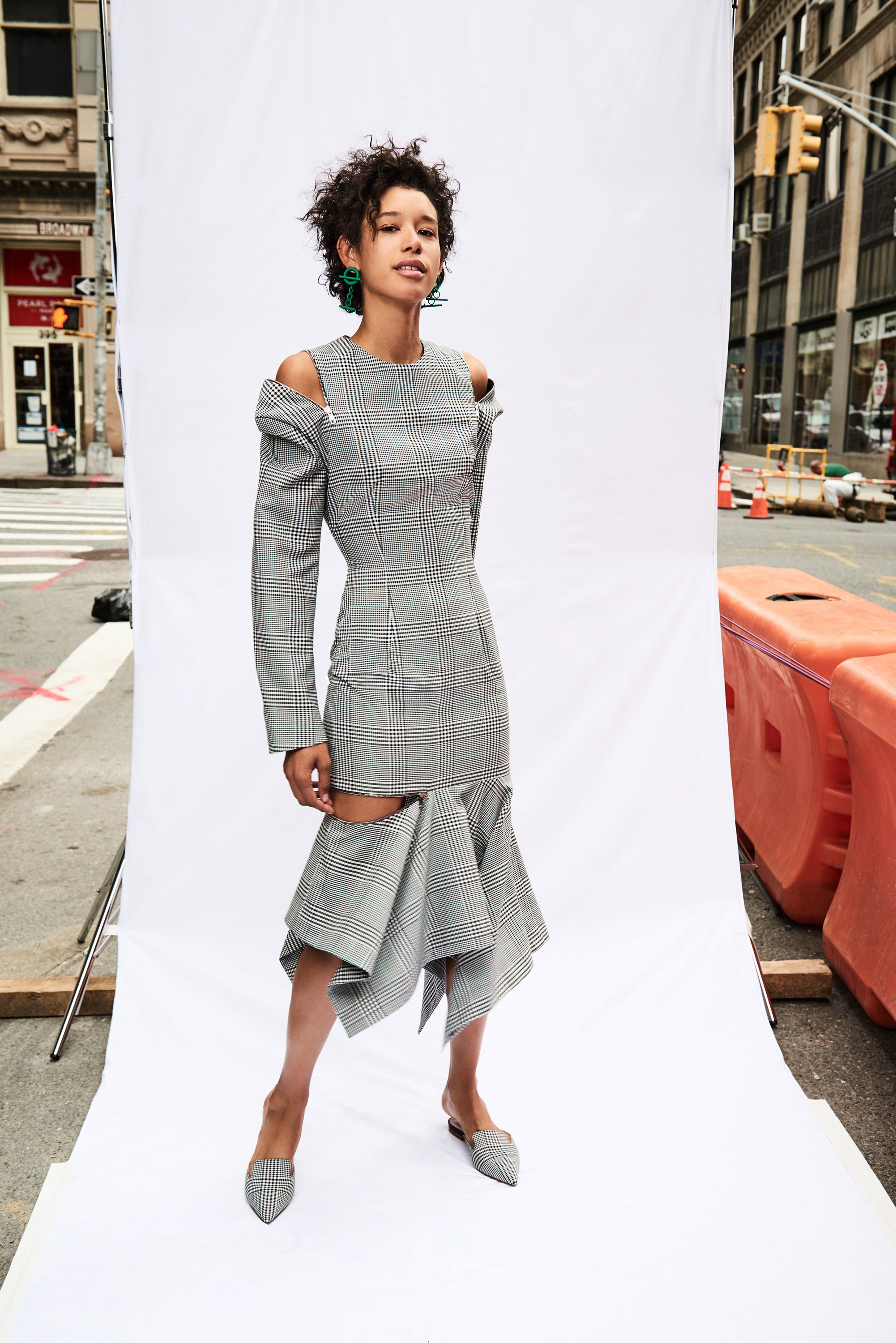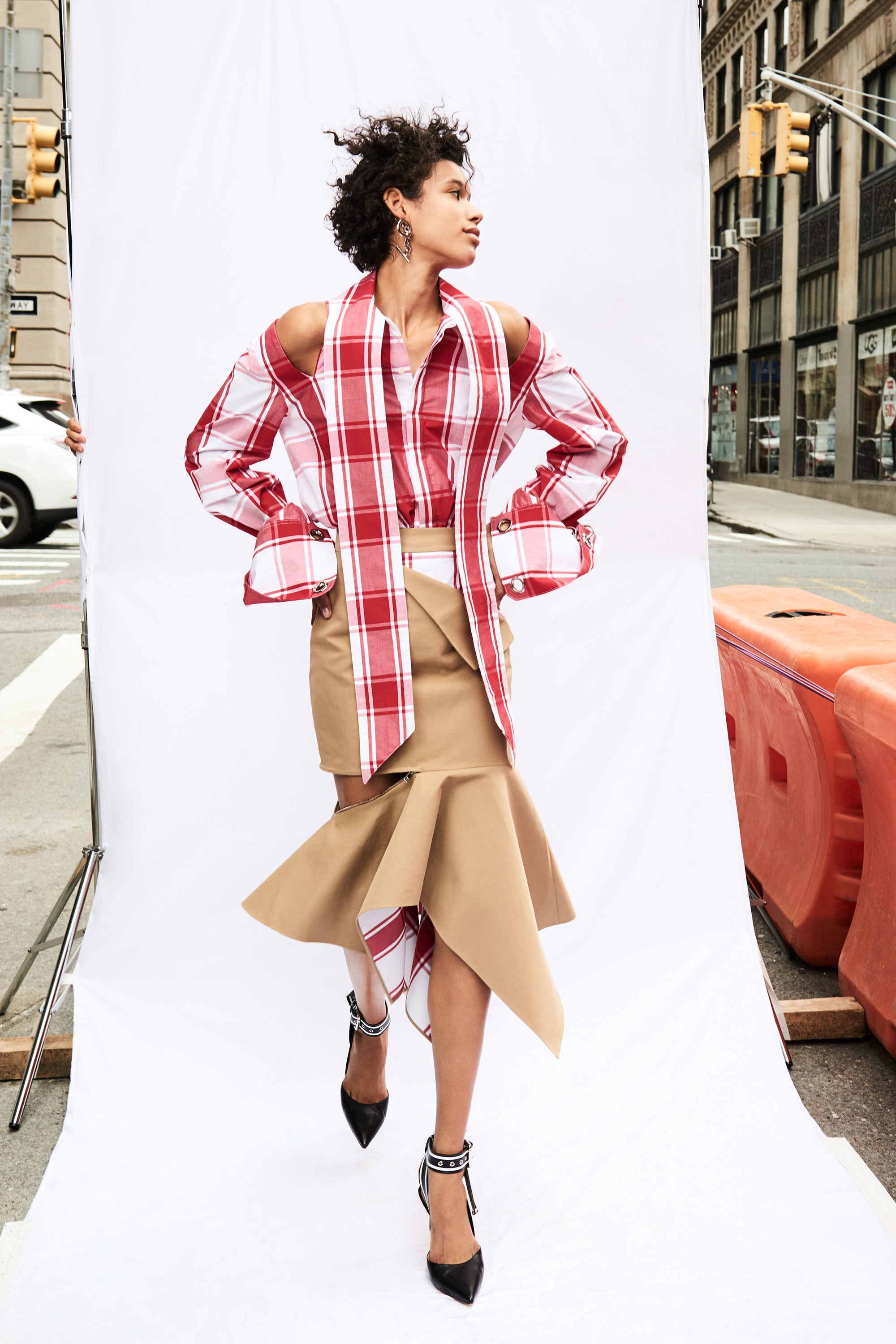 Checks are strewn across both slit shirt dresses and functional coats, while tops are deconstructed and disheveled in the best senses of the word—with asymmetric necklines and hemlines. Prints also peek through on flounce hem skirts with zip-accented hemlines that literally appear to almost fall off: just the right amount of edge for the already daring Monse lover.