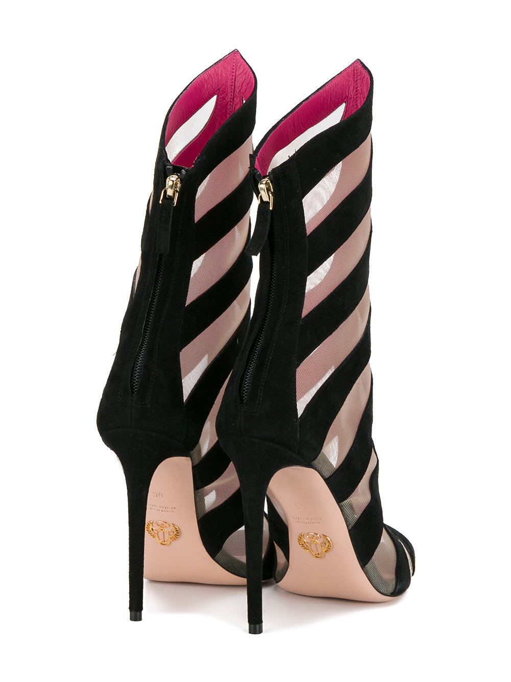 Her suede beauties boast symmetrical black and nude lines, a back zip closure and leather lining.