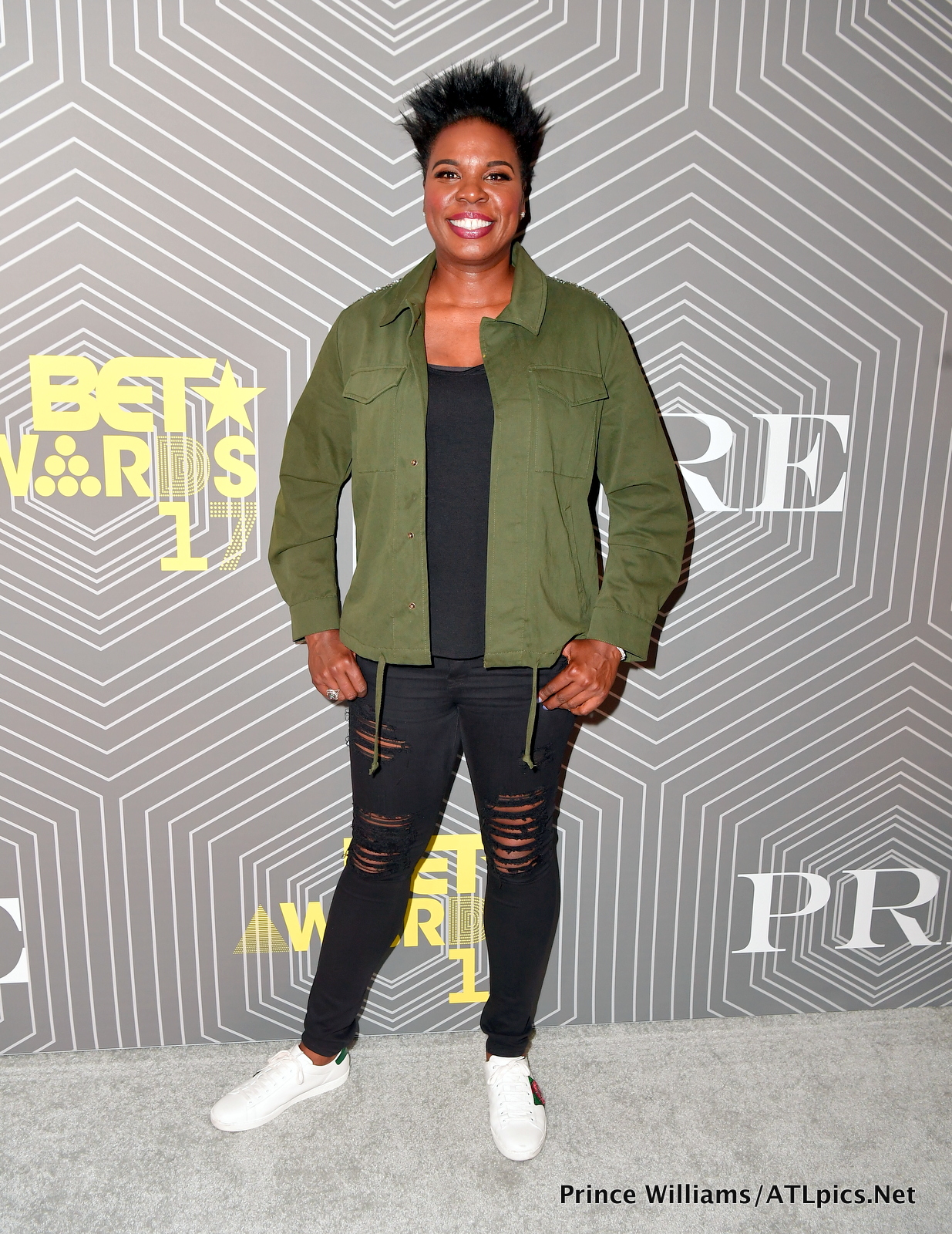 BET Awards host Leslie Jones kept her look casual in jeans and Gucci sneakers.