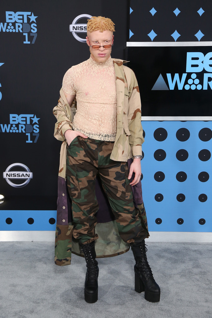 Shaun Ross layered it on in a long camo jacket, matching trousers, a sheer lace turtleneck, and platform boots.