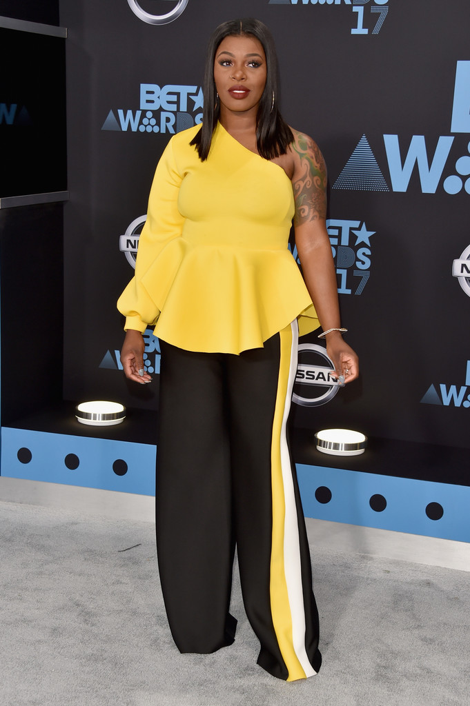 Ta’Rhonda Jones was on-trend in a one-shoulder peplum top and contrast stripe trousers. This was fab.