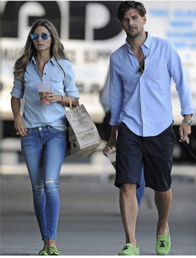 When you have a fashionista and German model as partners, you can easily end up matching effortlessly. Here, they wore similar blue toned button downs paired with lime green colored flats. Chic!