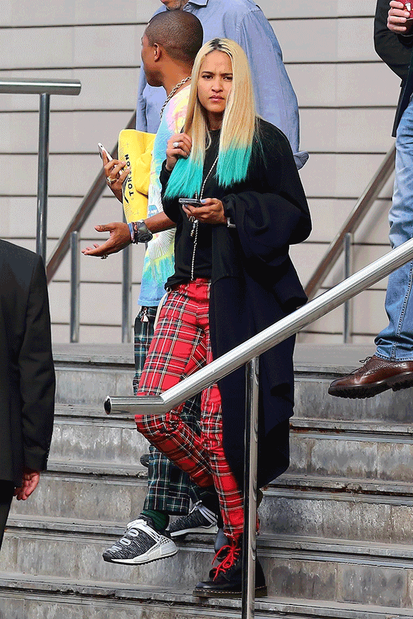 Pharrell and his wife, Helen Lasichanh are never a dull couple when it comes to expressing their unique wardrobe. While in Manchester, the two both wore plaid pants but kept their individuality, with her in red and Skateboard P in green.